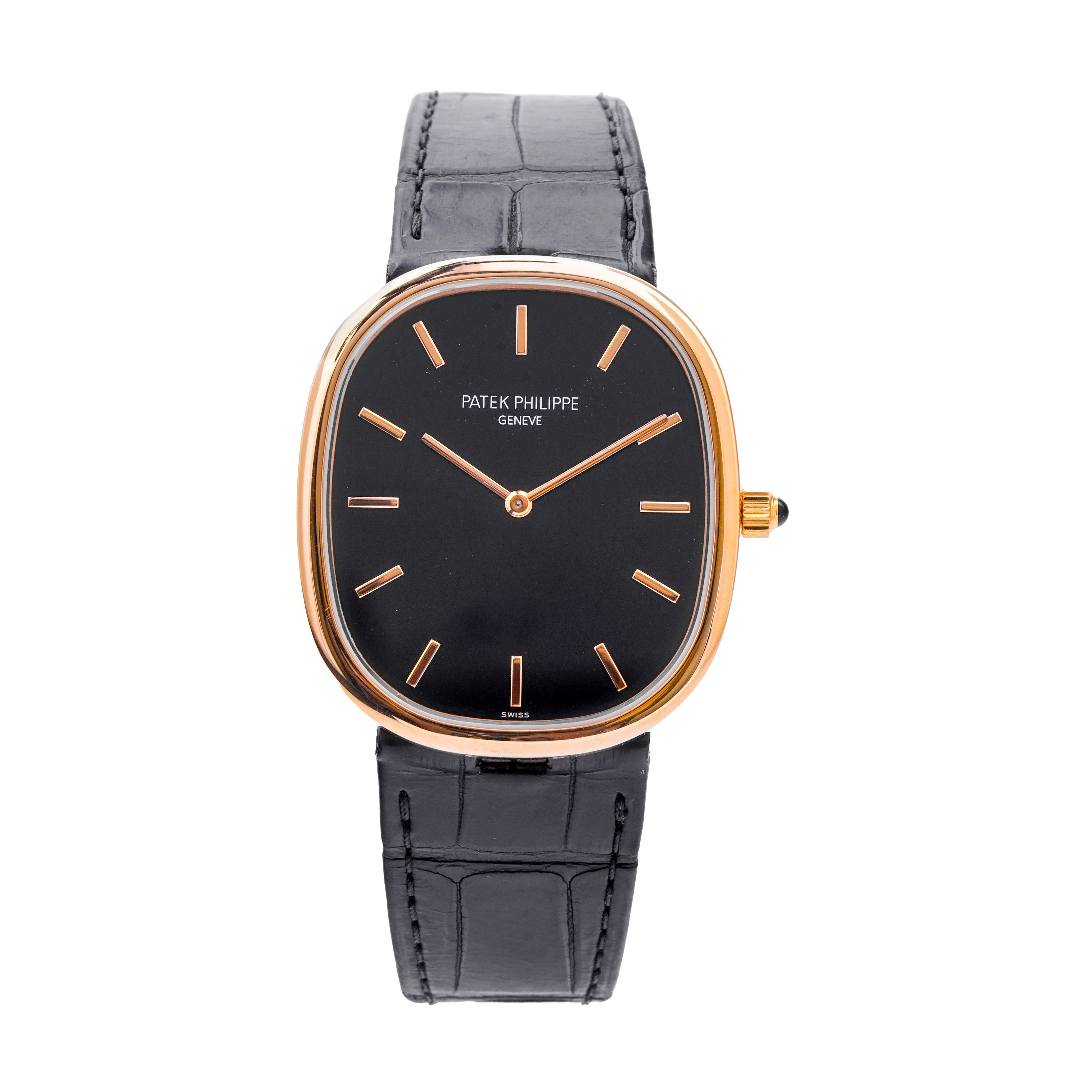 This Patek Philippe Golden Ellipse 5738R-001 has a black baton dial and a leather strap. This Patek Philippe has undergone a thorough inspection of water resistance, accuracy, functionality and condition to determine the level of reconditioning required to meet our strict standards. It has also been referenced against technical documents and manufacturer records where available to ensure authenticity and a clean history. All our watches have a 24-month warranty for your peace of mind.