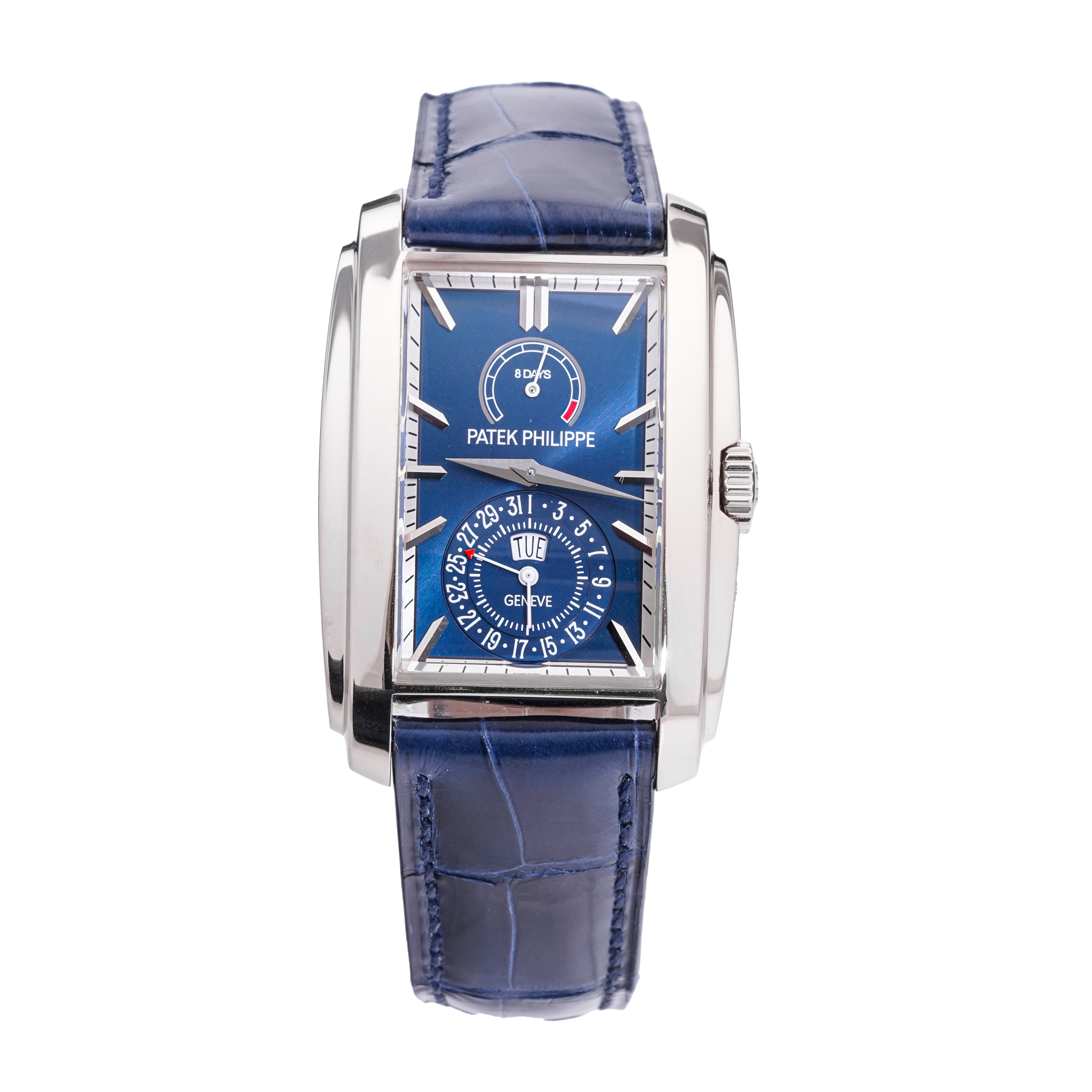 This Patek Philippe Gondolo 5200G-001 has a blue baton dial and a leather strap. This Patek Philippe has undergone a thorough inspection of water resistance, accuracy, functionality and condition to determine the level of reconditioning required to meet our strict standards. It has also been referenced against technical documents and manufacturer records where available to ensure authenticity and a clean history. All our watches have a 24-month warranty for your peace of mind.