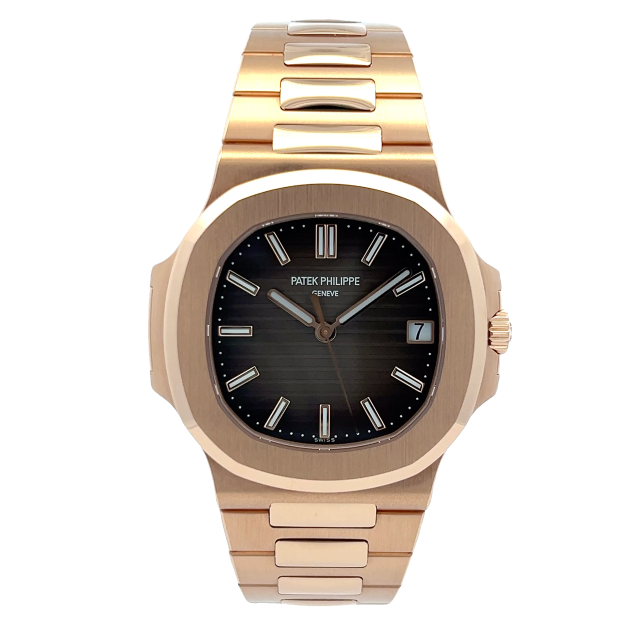 This Patek Philippe Nautilus 5711/1R-001 has a brown baton dial and a bracelet strap. This Patek Philippe has undergone a thorough inspection of water resistance, accuracy, functionality and condition to determine the level of reconditioning required to meet our strict standards. It has also been referenced against technical documents and manufacturer records where available to ensure authenticity and a clean history. All our watches have a 24-month warranty for your peace of mind.
