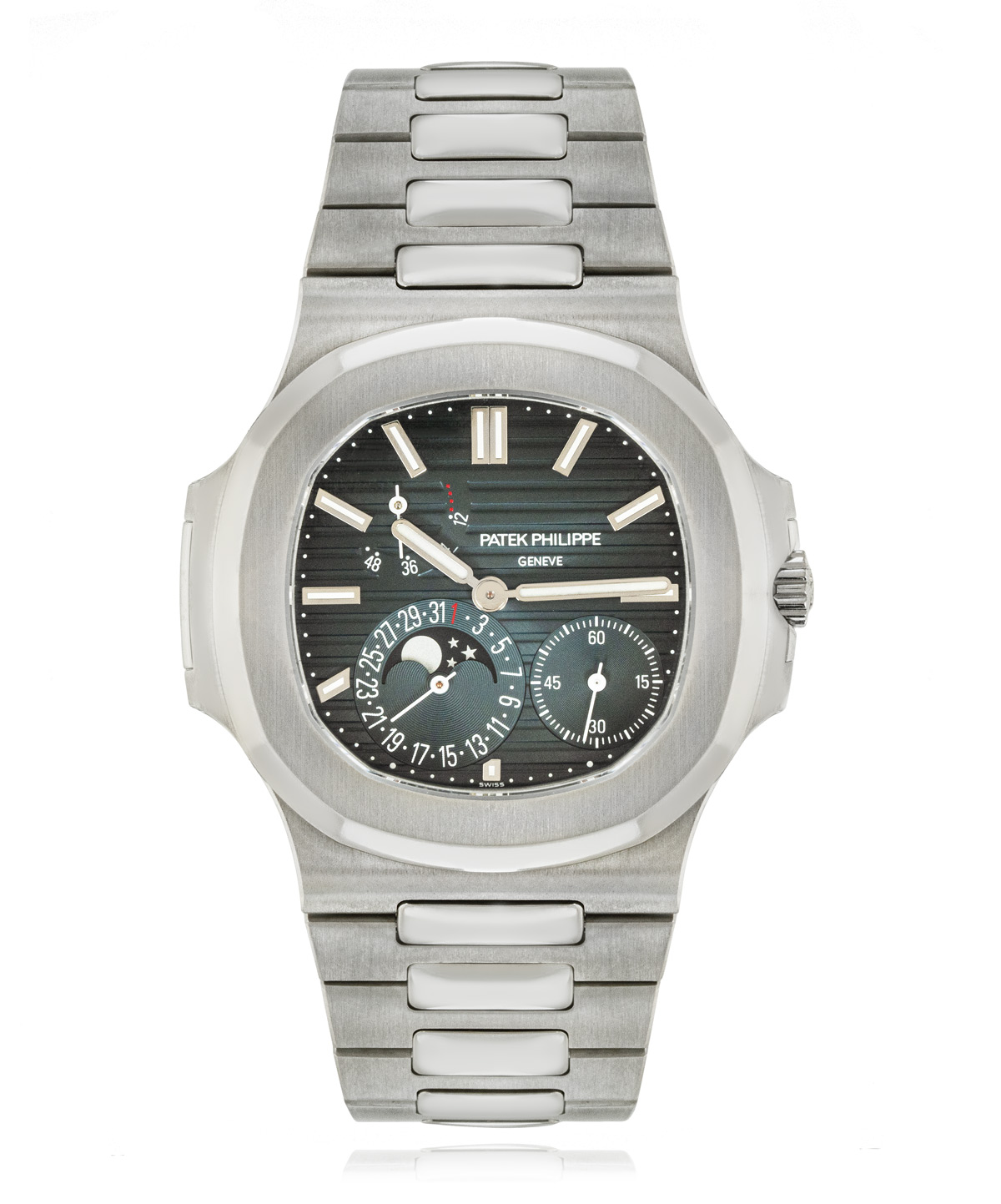 This Patek Philippe Nautilus 5712/1A-001 has a black & blue dial and a bracelet strap. This Patek Philippe has undergone a thorough inspection of water resistance, accuracy, functionality and condition to determine the level of reconditioning required to meet our strict standards. It has also been referenced against technical documents and manufacturer records where available to ensure authenticity and a clean history. All our watches have a 24-month warranty for your peace of mind.