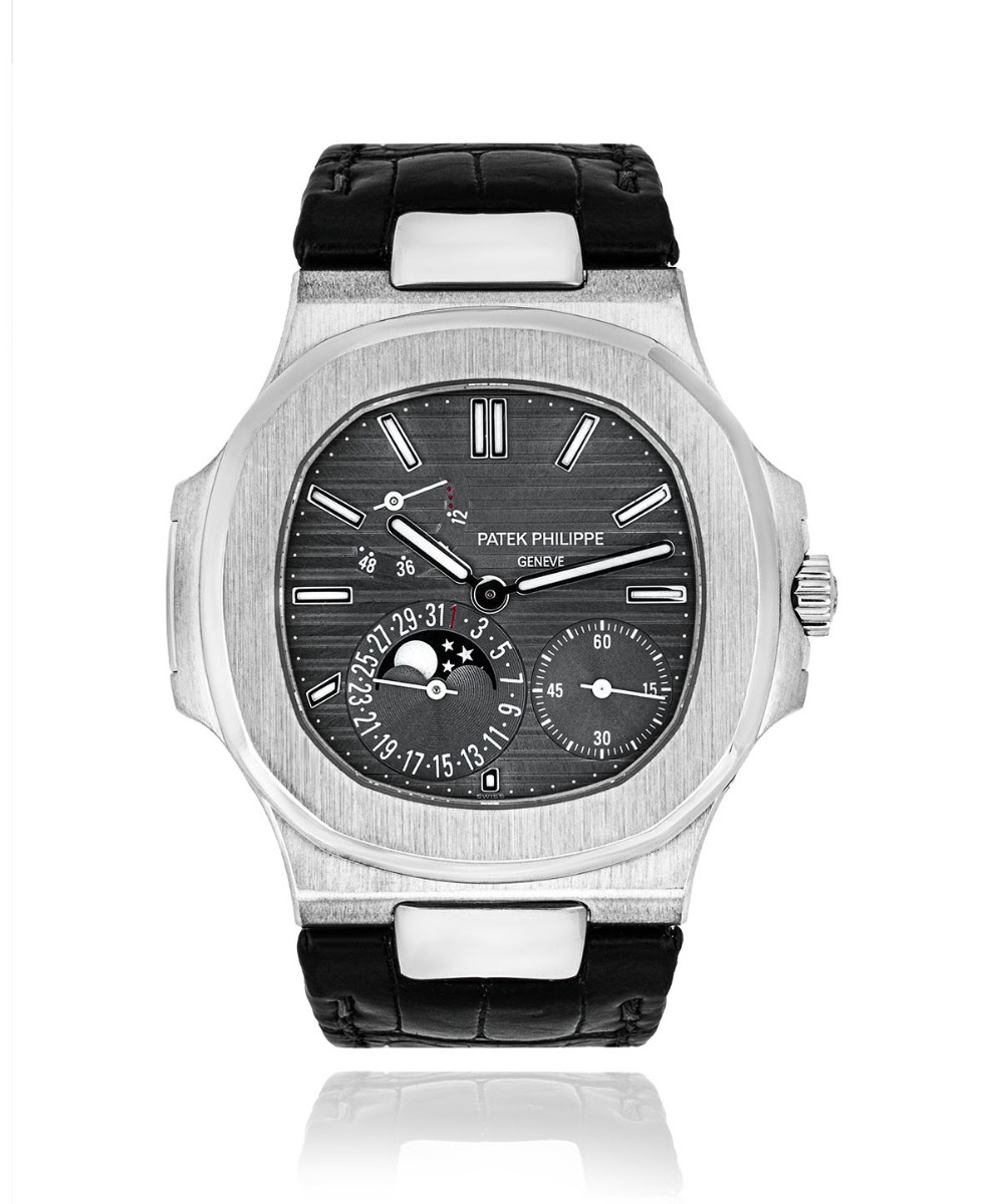 Created by Gerald Genta and like many of his famous watches, the Nautilus is a horological legend. By far Patek Philippe's best known and most desirable sports watch, it's celebrated for some of the best examples of emblematic Genta trademarks: large, angular bezel, comparatively thin case, integrated bracelet and bold, if simple, dial. The design is based on the traditional shape of portholes, up to and including the hinges often found on the sides—hence the Nautilus' unmistakable “ears”. This white gold model brings extra appeal in the form of several additional complications: a small seconds, a power reserve indicator, and most impressively, a combined date and moonphase display.