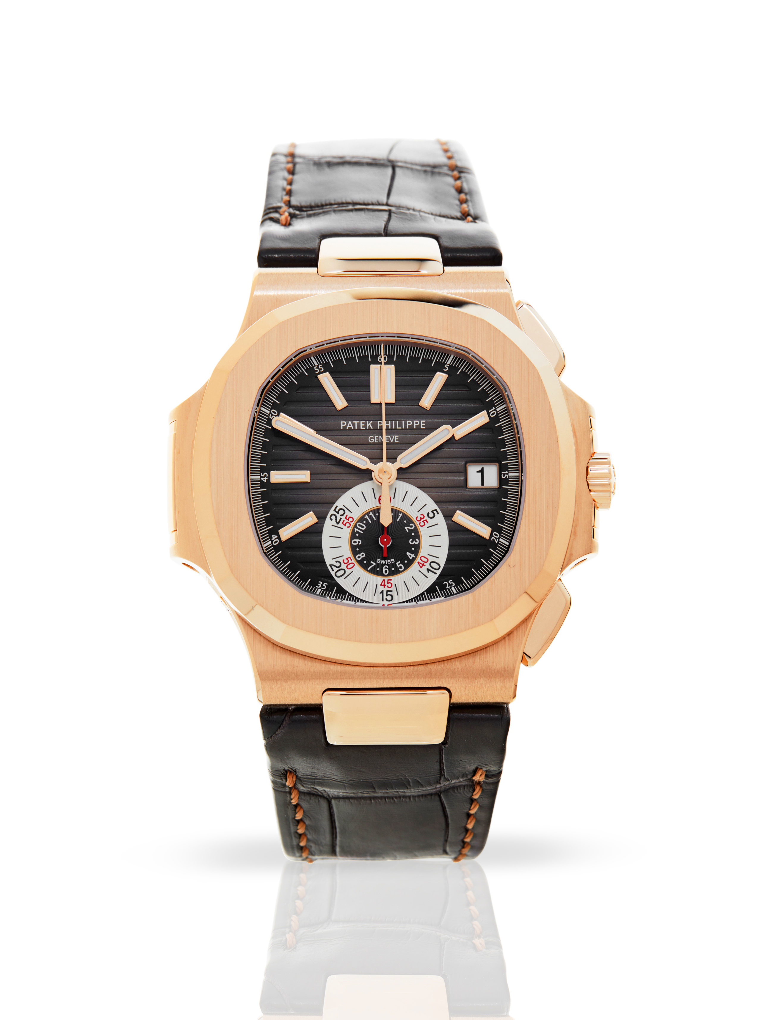 Originally designed in 1976, the Nautilus has changed very little over the years. The case is still clamped together by the pinned “ears” flanking the case, which were inspired by the hinges on portholes. It still features other beloved design traits too, the multifaceted bezel, the simple engraved dial, the integrated, tapering bracelet, and a slender profile often neglected by modern designers. The Nautilus is about as good as sports watches get, and comes from one of the most renowned watchmakers in the world. This exquisite rose gold model has a warm brown-black dial and a striking chronograph complication that displays both minutes and hours on a single “monocounter” at 6 o'clock.