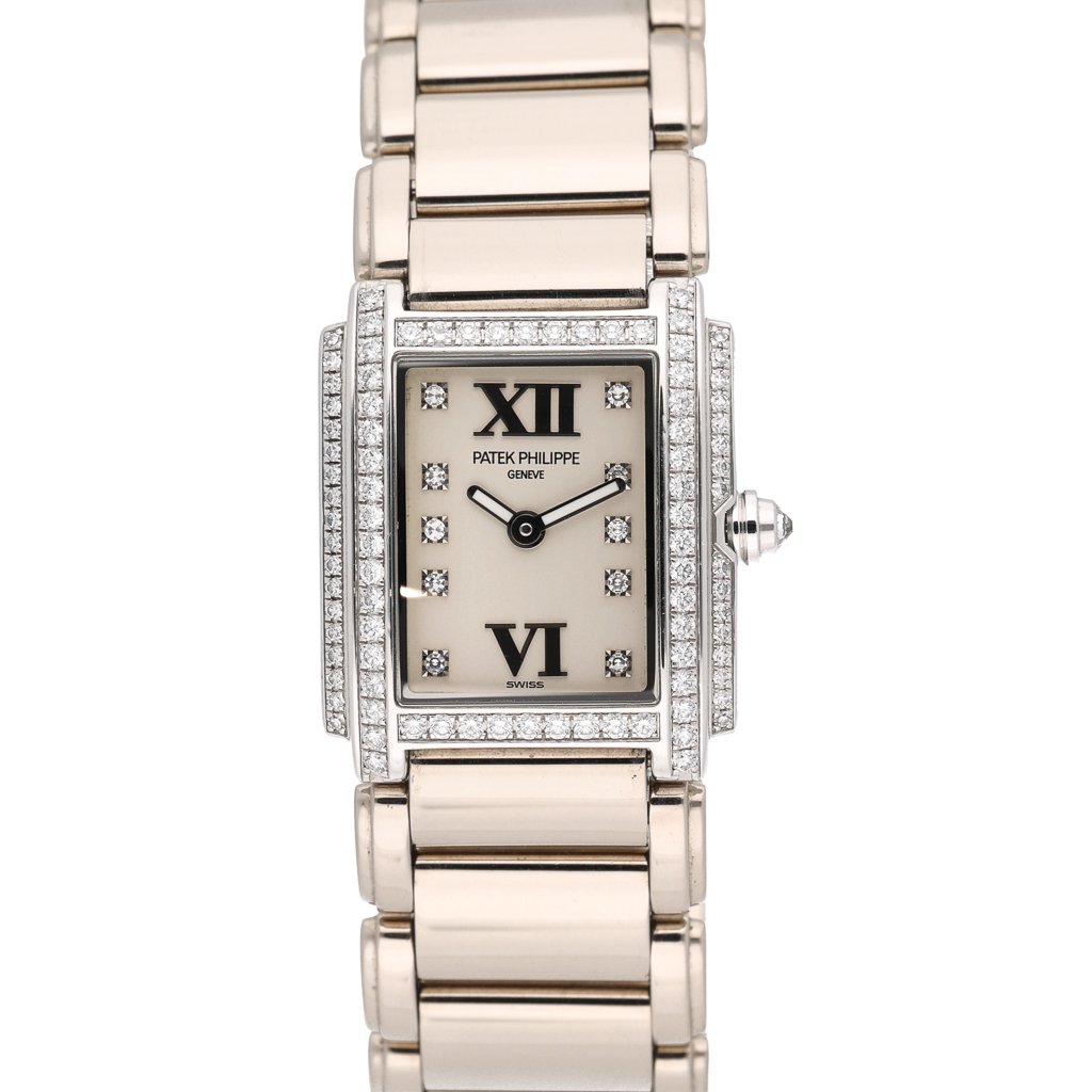 This Patek Philippe Twenty-4 4908/200G has a white roman numeral diamond dial and a bracelet strap. This Patek Philippe has undergone a thorough inspection of water resistance, accuracy, functionality and condition to determine the level of reconditioning required to meet our strict standards. It has also been referenced against technical documents and manufacturer records where available to ensure authenticity and a clean history. All our watches have a 24-month warranty for your peace of mind.