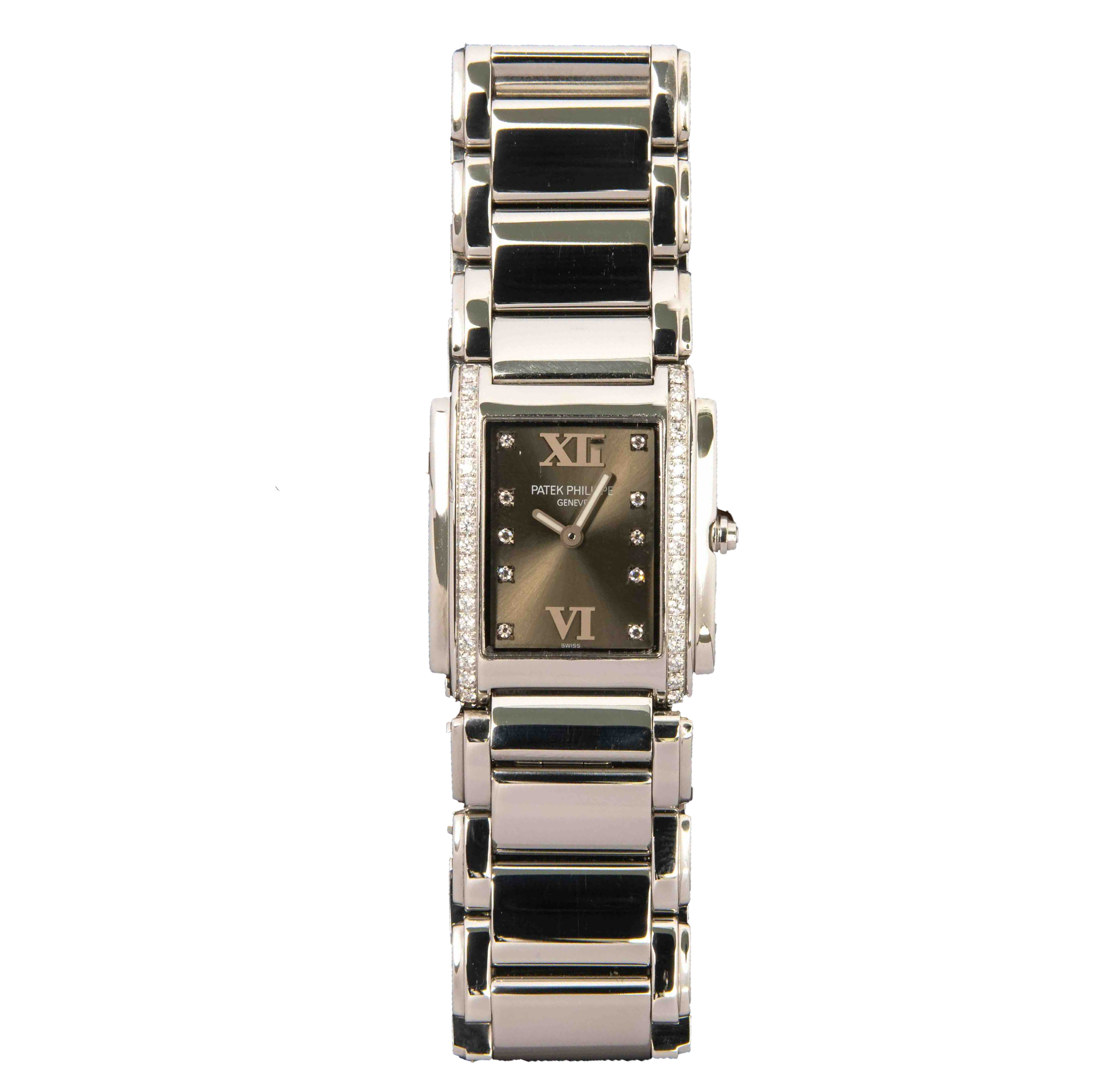 This Patek Philippe Twenty-4 4910/10A-010 has a grey diamond dial and a bracelet strap. This Patek Philippe has undergone a thorough inspection of water resistance, accuracy, functionality and condition to determine the level of reconditioning required to meet our strict standards. It has also been referenced against technical documents and manufacturer records where available to ensure authenticity and a clean history. All our watches have a 24-month warranty for your peace of mind.