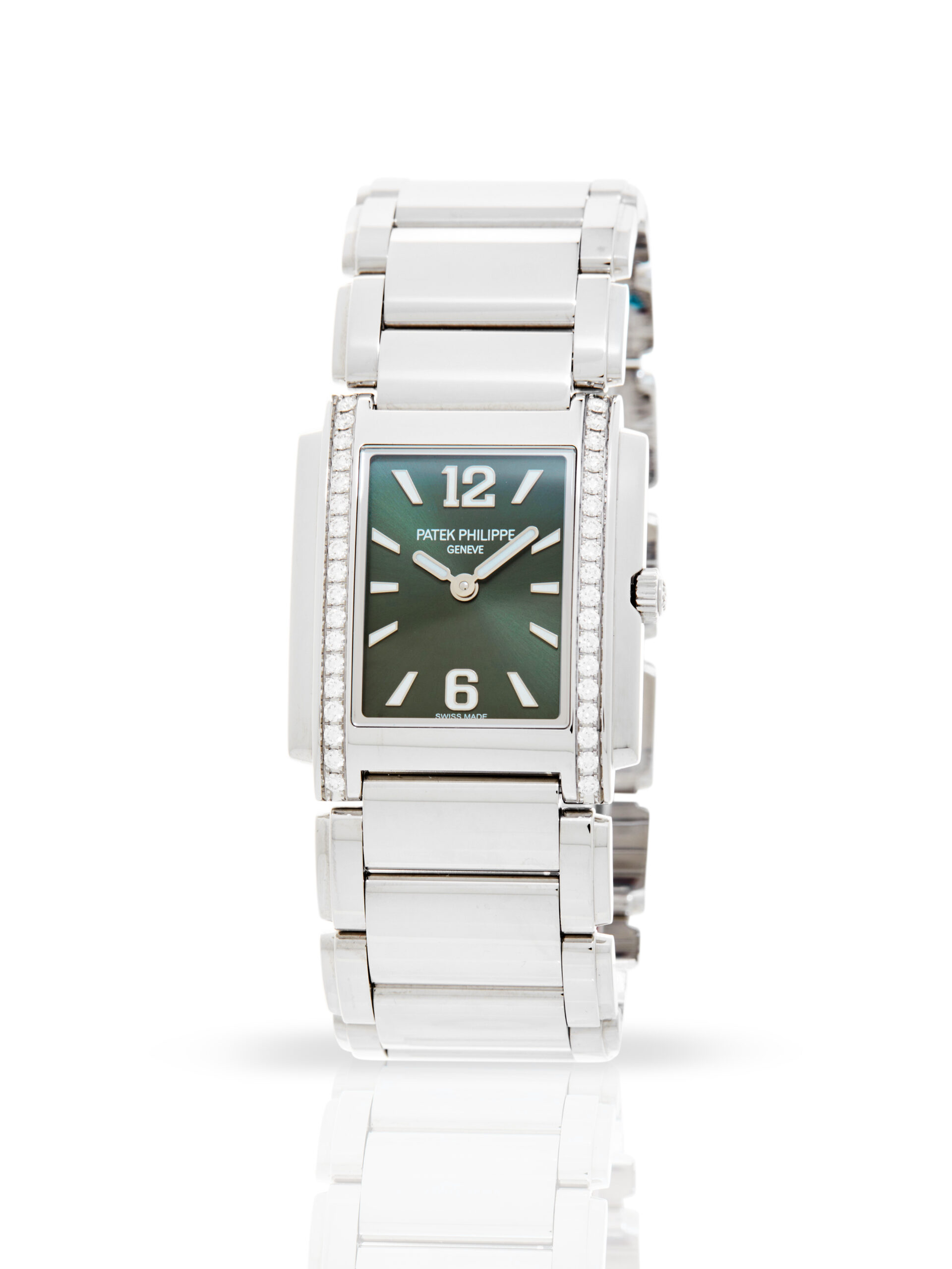 This Patek Philippe Twenty-4 4910/1200A-011 has a green baton dial and a bracelet strap. This Patek Philippe has undergone a thorough inspection of water resistance, accuracy, functionality and condition to determine the level of reconditioning required to meet our strict standards. It has also been referenced against technical documents and manufacturer records where available to ensure authenticity and a clean history. Our watches have a 24-month warranty for your peace of mind, in conjunction with any remaining manufacturer’s warranty from new or from service.