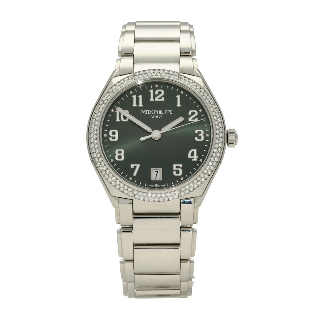 This Patek Philippe Twenty-4 7300/1200A-011 has a green arabic dial and a bracelet strap. This Patek Philippe has undergone a thorough inspection of water resistance, accuracy, functionality and condition to determine the level of reconditioning required to meet our strict standards. It has also been referenced against technical documents and manufacturer records where available to ensure authenticity and a clean history. All our watches have a 24-month warranty for your peace of mind.