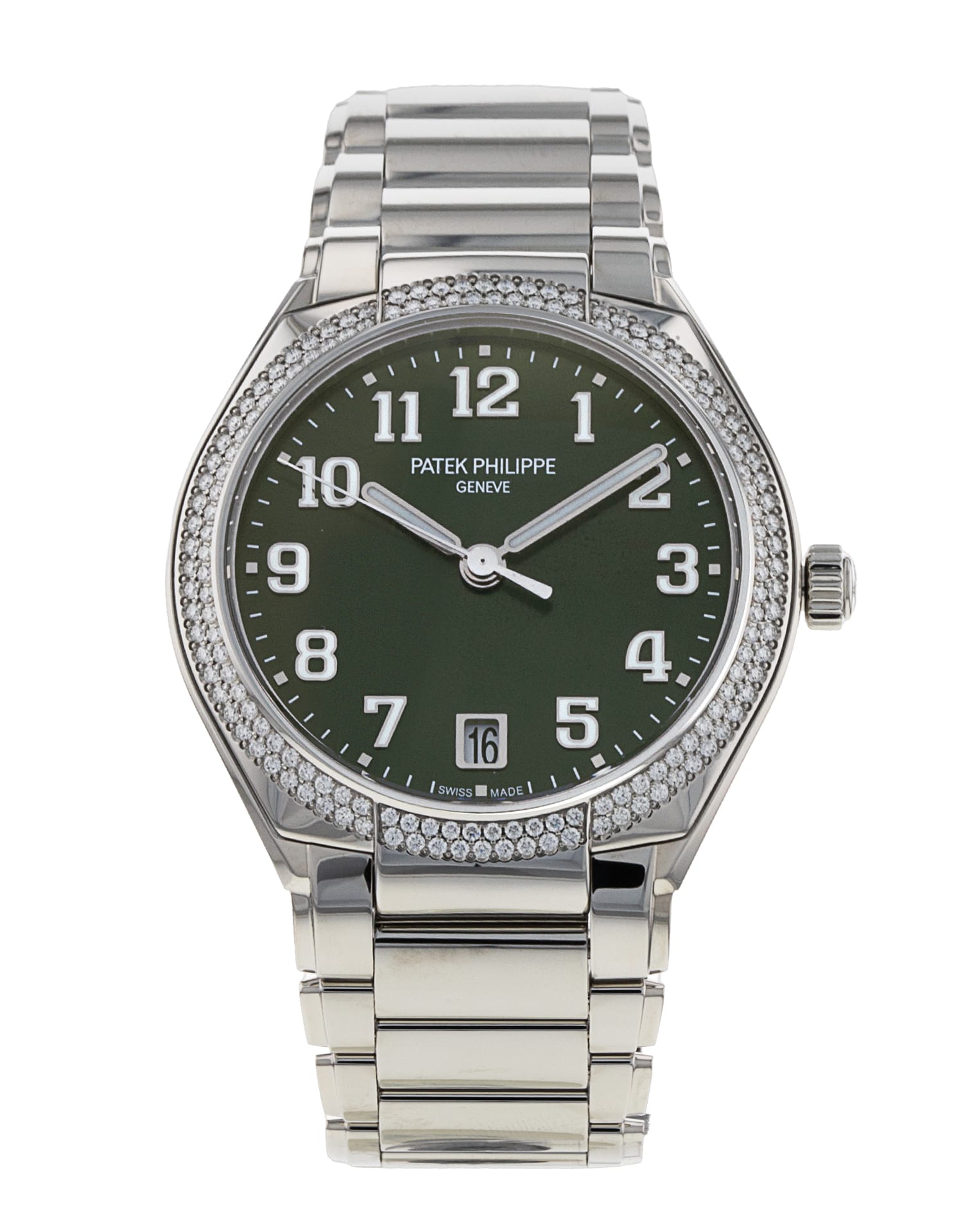 This Patek Philippe Twenty-4 7300/1200A-011 has a green arabic dial and a bracelet strap. This Patek Philippe has undergone a thorough inspection of water resistance, accuracy, functionality and condition to determine the level of reconditioning required to meet our strict standards. It has also been referenced against technical documents and manufacturer records where available to ensure authenticity and a clean history. Our watches have a 24-month warranty for your peace of mind, in conjunction with any remaining manufacturer’s warranty from new or from service.