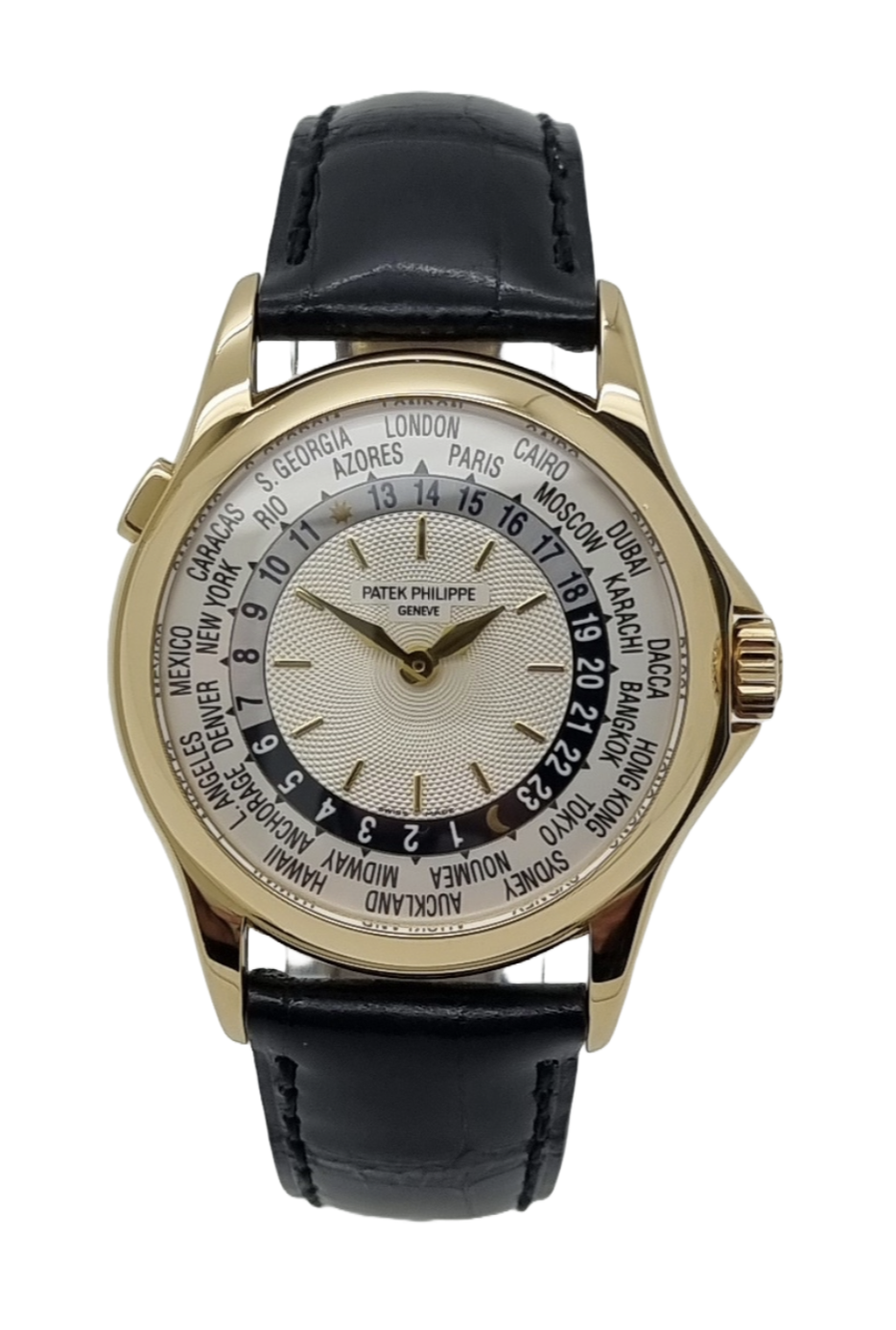 Invented by Louis Cottier in the 1930s, Patek Philippe's World Timer is widely considered the cream of luxury traveling watches. Rather than simply adding an extra hand to show a second time zone, the watch features a much more complex – yet intuitive and satisfying – operation. The current home city is shown at 12 o'clock, and the current hour is directly beneath it, continuously moving counter-clockwise. The 5110 is one of the finest models in Patek's history – many collectors prefer it even to the more recent 5130, due to its smaller size and beautiful guilloché dial. It uses the spectacular in-house Cal. 240, which requires just a single button press to change the time zone on all three indications simultaneously (hands, hour track and reference city).