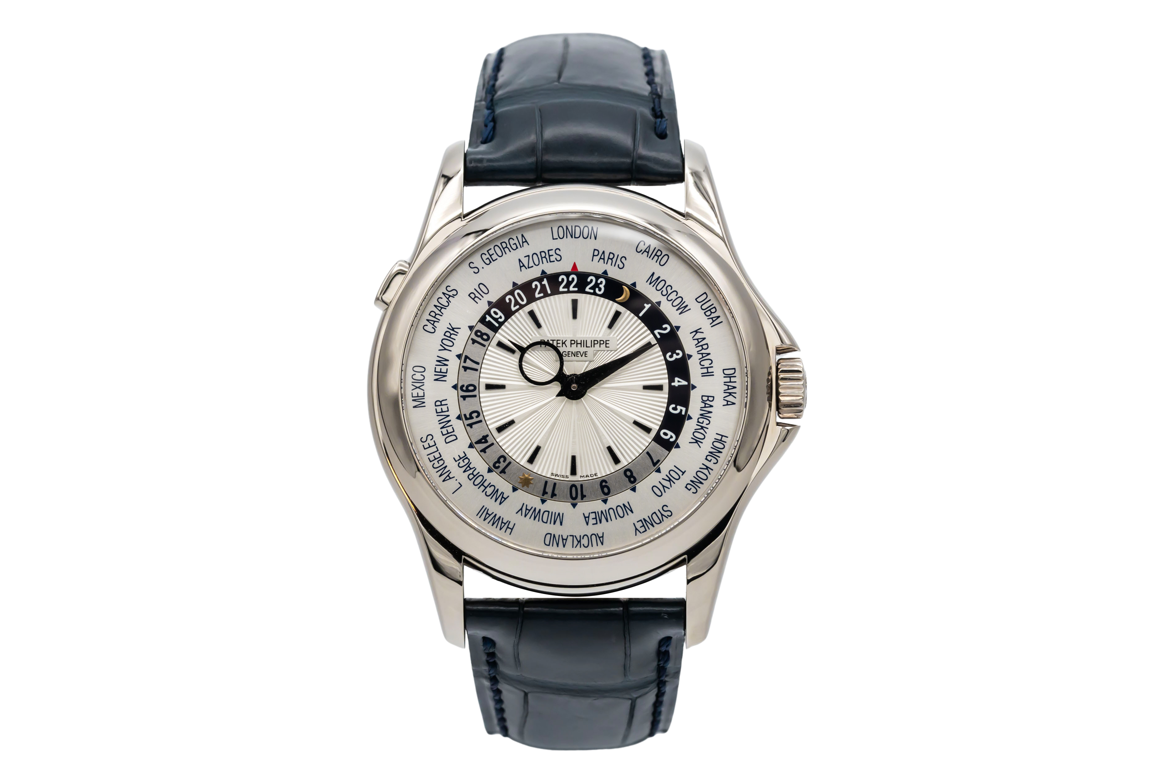 This Patek Philippe World Time 5130G-001 has a silver dial and a leather strap. This Patek Philippe has undergone a thorough inspection of water resistance, accuracy, functionality and condition to determine the level of reconditioning required to meet our strict standards. It has also been referenced against technical documents and manufacturer records where available to ensure authenticity and a clean history. All our watches have a 24-month warranty for your peace of mind.