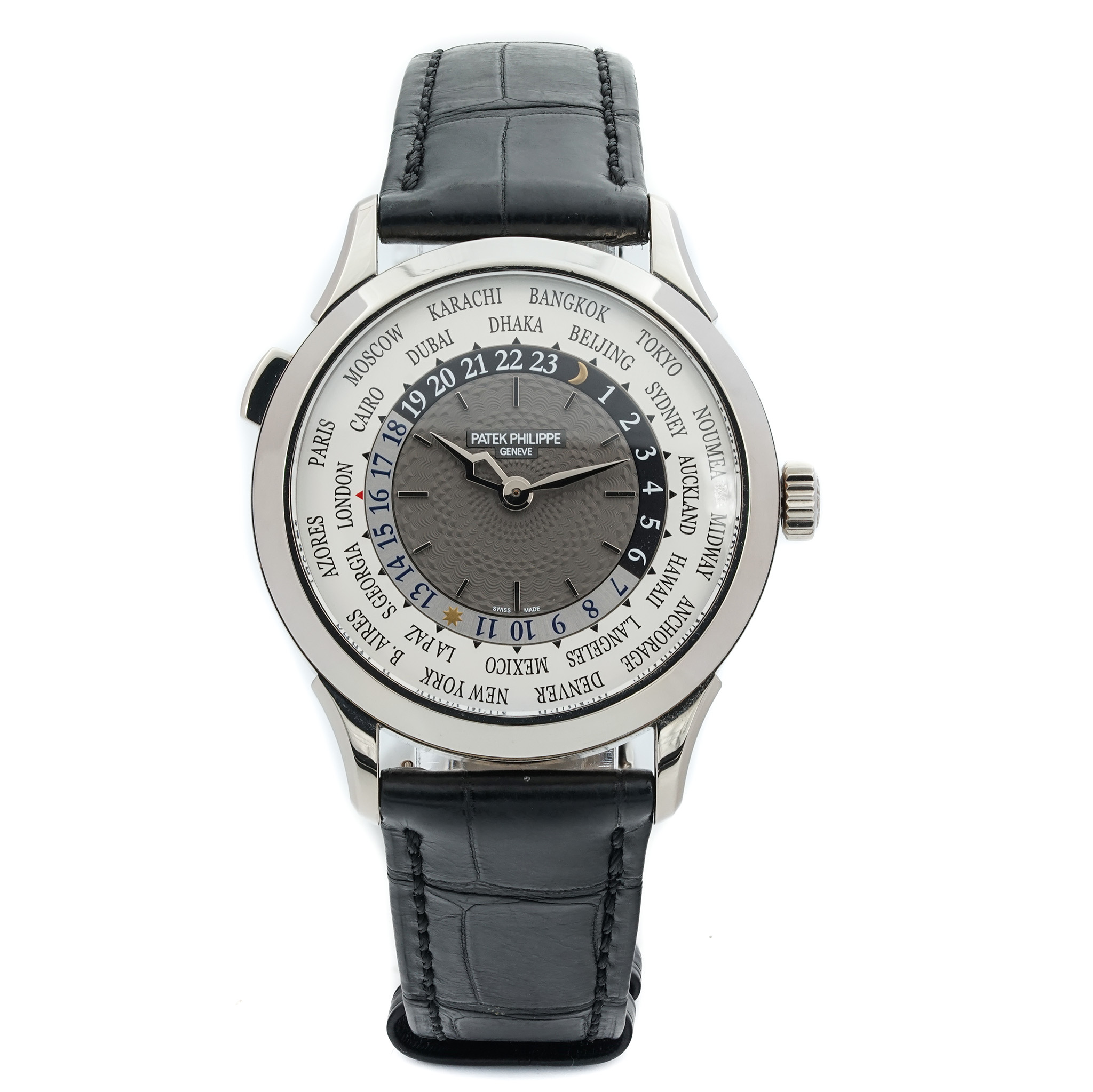 This Patek Philippe World Time 5230G-014 has a grey dial and a leather strap. This Patek Philippe has undergone a thorough inspection of water resistance, accuracy, functionality and condition to determine the level of reconditioning required to meet our strict standards. It has also been referenced against technical documents and manufacturer records where available to ensure authenticity and a clean history. All our watches have a 24-month warranty for your peace of mind.