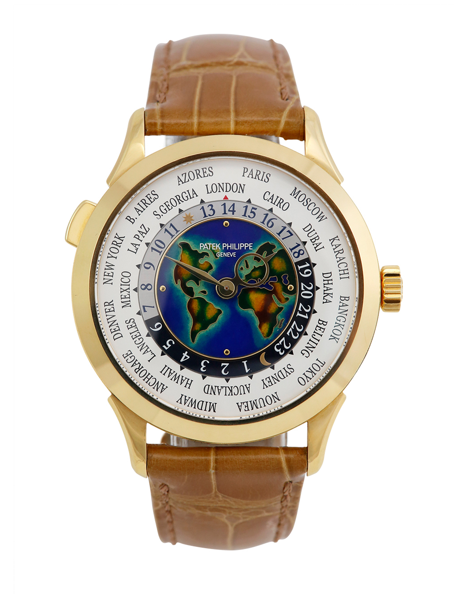 This Patek Philippe World Time 5231J-001 has a europe, africa, americas - cloisonne enamel dial and a leather strap. This Patek Philippe has undergone a thorough inspection of water resistance, accuracy, functionality and condition to determine the level of reconditioning required to meet our strict standards. It has also been referenced against technical documents and manufacturer records where available to ensure authenticity and a clean history. All our watches have a 24-month warranty for your peace of mind.