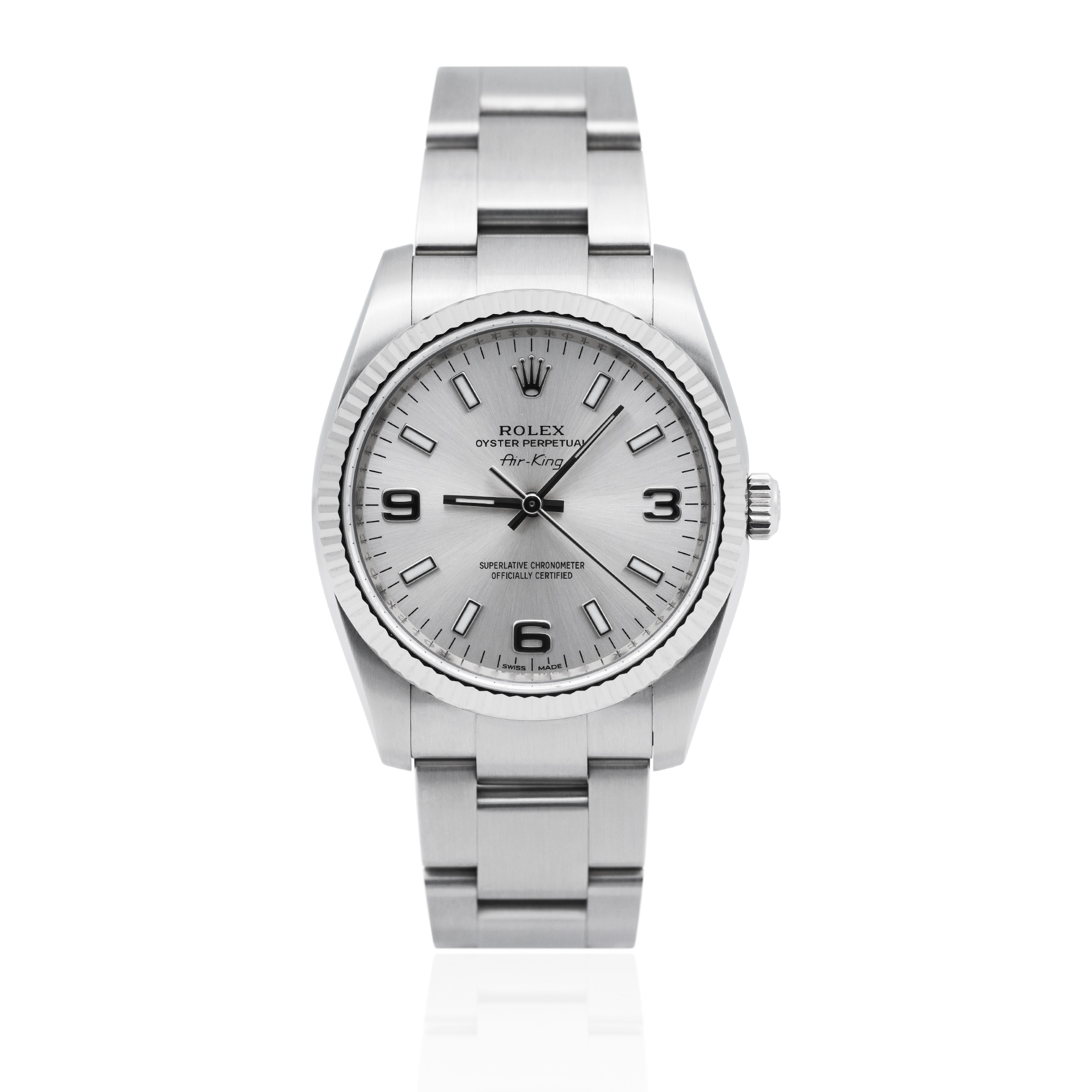 This Rolex Air-King 114234 has a silver quarter arabic dial and a bracelet strap. This Rolex has undergone a thorough inspection of water resistance, accuracy, functionality and condition to determine the level of reconditioning required to meet our strict standards. It has also been referenced against technical documents and manufacturer records where available to ensure authenticity and a clean history. All our watches have a 24-month warranty for your peace of mind. One of our skilled polishing technicians has removed marks on the case and bracelet of this watch, brought about by daily wear and tear, which is why this watch does not come with the remaining manufacturer’s warranty.