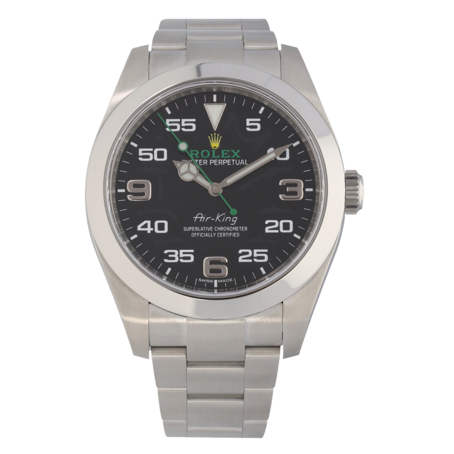 This Rolex Air-King 116900 has a black arabic dial and a bracelet strap. This Rolex has undergone a thorough inspection of water resistance, accuracy, functionality and condition to determine the level of reconditioning required to meet our strict standards. It has also been referenced against technical documents and manufacturer records where available to ensure authenticity and a clean history. All our watches have a 24-month warranty for your peace of mind. One of our skilled polishing technicians has removed marks on the case and bracelet of this watch, brought about by daily wear and tear, which is why this watch does not come with the remaining manufacturer’s warranty.