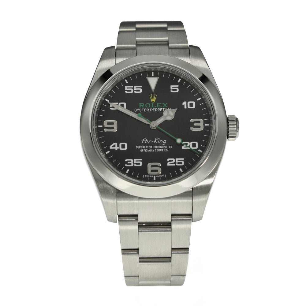 This Rolex Air-King 116900 has a black arabic dial and a bracelet strap. This Rolex has undergone a thorough inspection of water resistance, accuracy, functionality and condition to determine the level of reconditioning required to meet our strict standards. It has also been referenced against technical documents and manufacturer records where available to ensure authenticity and a clean history. All our watches have a 24-month warranty for your peace of mind. One of our skilled polishing technicians has removed marks on the case and bracelet of this watch, brought about by daily wear and tear, which is why this watch does not come with the remaining manufacturer’s warranty.