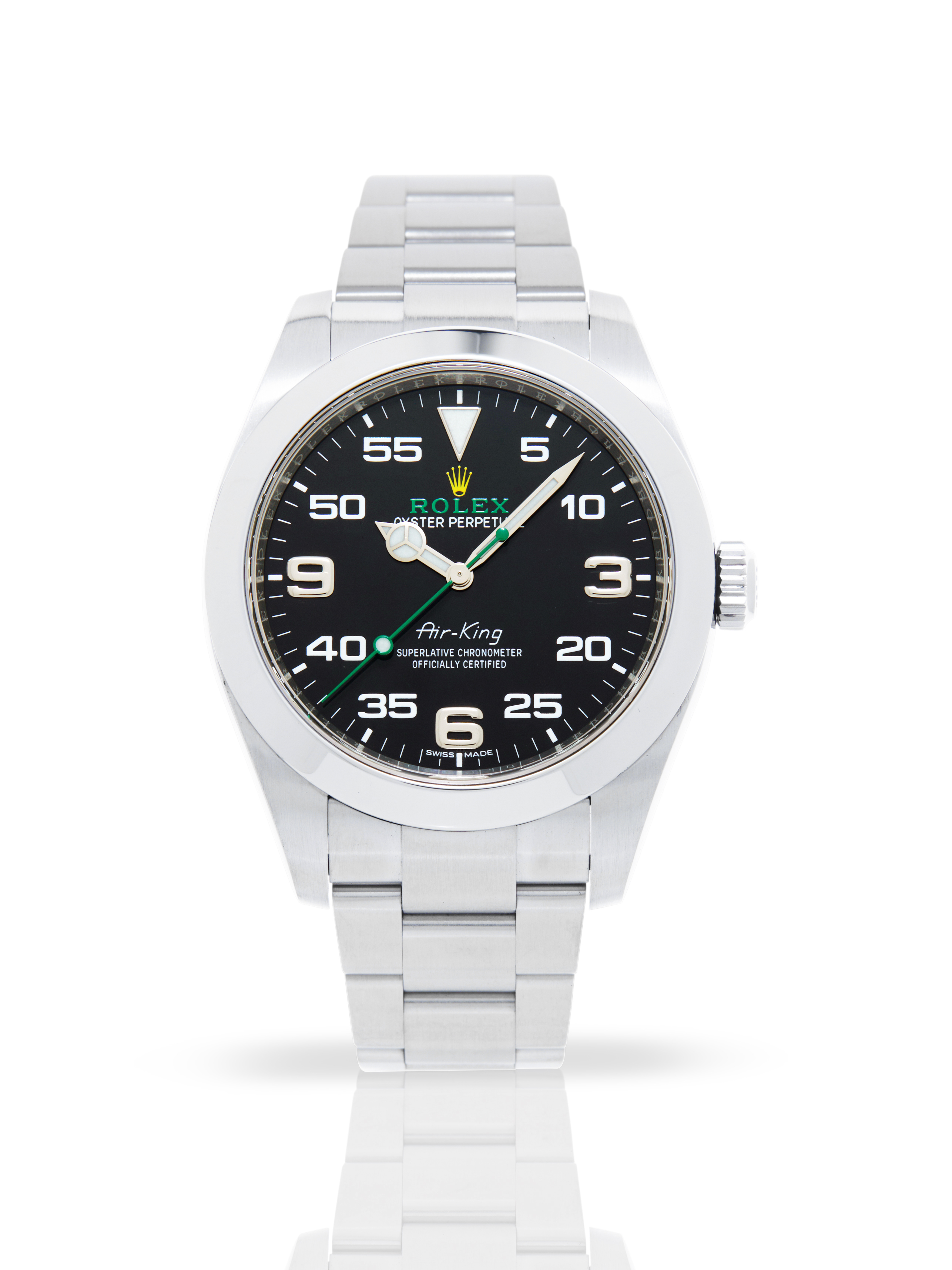 This Rolex Air-King 116900 has a black arabic dial and a bracelet strap. This Rolex has undergone a thorough inspection of water resistance, accuracy, functionality and condition to determine the level of reconditioning required to meet our strict standards. It has also been referenced against technical documents and manufacturer records where available to ensure authenticity and a clean history. Our watches have a 24-month warranty for your peace of mind, in conjunction with any remaining manufacturer’s warranty from new or from service. To maintain the manufacturer’s warranty on this watch, it has not been polished in our service centre.