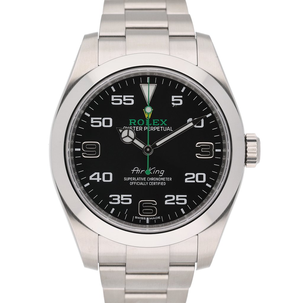 This Rolex Air-King 116900 has a black arabic dial and a bracelet strap. This Rolex has undergone a thorough inspection of water resistance, accuracy, functionality and condition to determine the level of reconditioning required to meet our strict standards. It has also been referenced against technical documents and manufacturer records where available to ensure authenticity and a clean history. All our watches have a 24-month warranty for your peace of mind. One of our skilled polishing technicians has removed marks on the case and bracelet of this watch, brought about by daily wear and tear, which is why this watch does not come with the remaining manufacturer’s warranty.