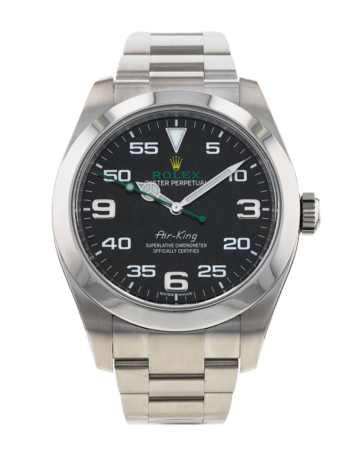 This Rolex Air-King 116900 has a black arabic dial and a bracelet strap. This Rolex has undergone a thorough inspection of water resistance, accuracy, functionality and condition to determine the level of reconditioning required to meet our strict standards. It has also been referenced against technical documents and manufacturer records where available to ensure authenticity and a clean history. All our watches have a 24-month warranty for your peace of mind. One of our skilled polishing technicians has removed marks on the case and bracelet of this watch, brought about by daily wear and tear, which is why this watch does not come with the remaining manufacturer’s warranty.