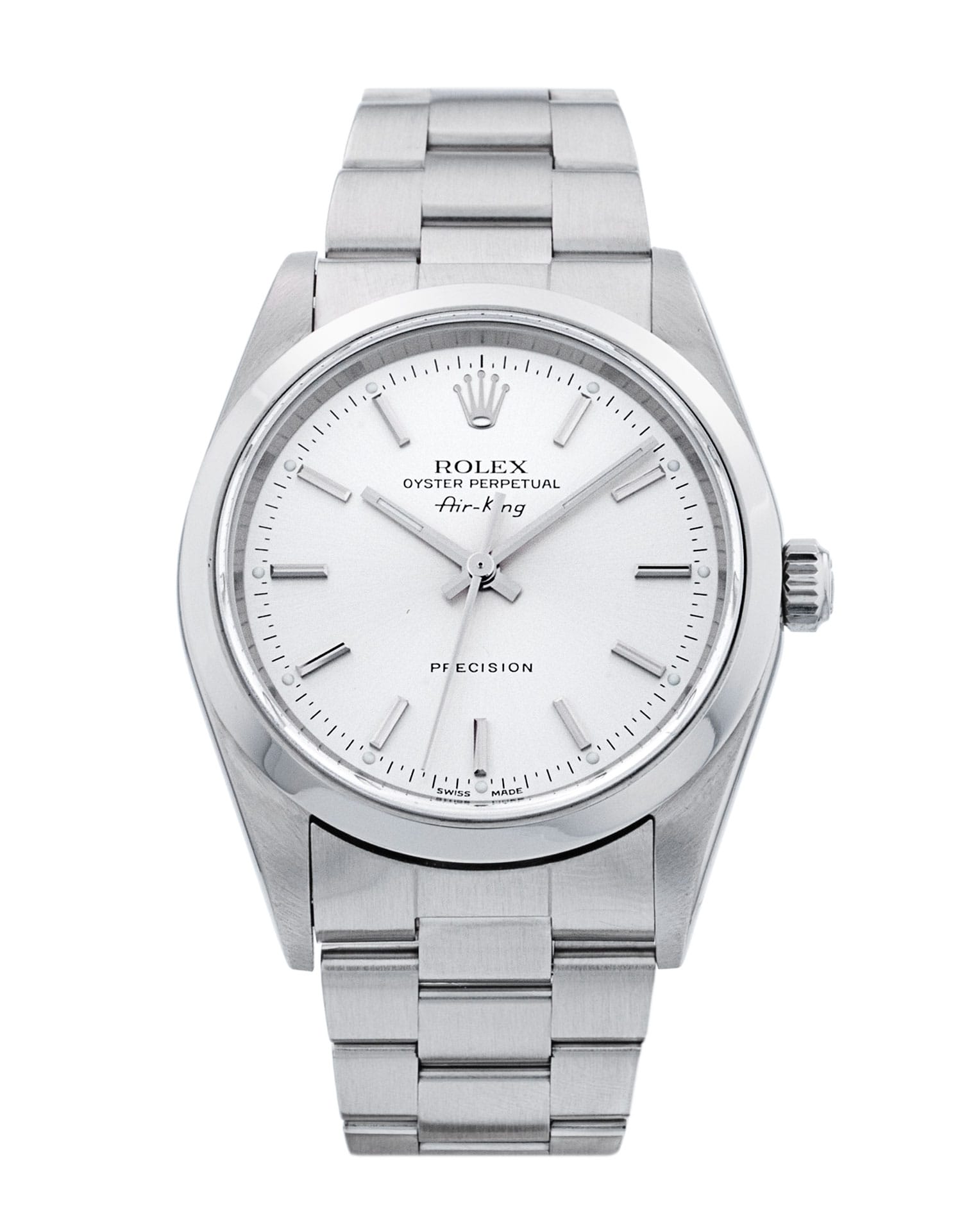 This Rolex Air-King 14000 has a silver baton dial and a bracelet strap. This Rolex has undergone a thorough inspection of water resistance, accuracy, functionality and condition to determine the level of reconditioning required to meet our strict standards. It has also been referenced against technical documents and manufacturer records where available to ensure authenticity and a clean history. All our watches have a 24-month warranty for your peace of mind. One of our skilled polishing technicians has removed marks on the case and bracelet of this watch, brought about by daily wear and tear, which is why this watch does not come with the remaining manufacturer’s warranty.