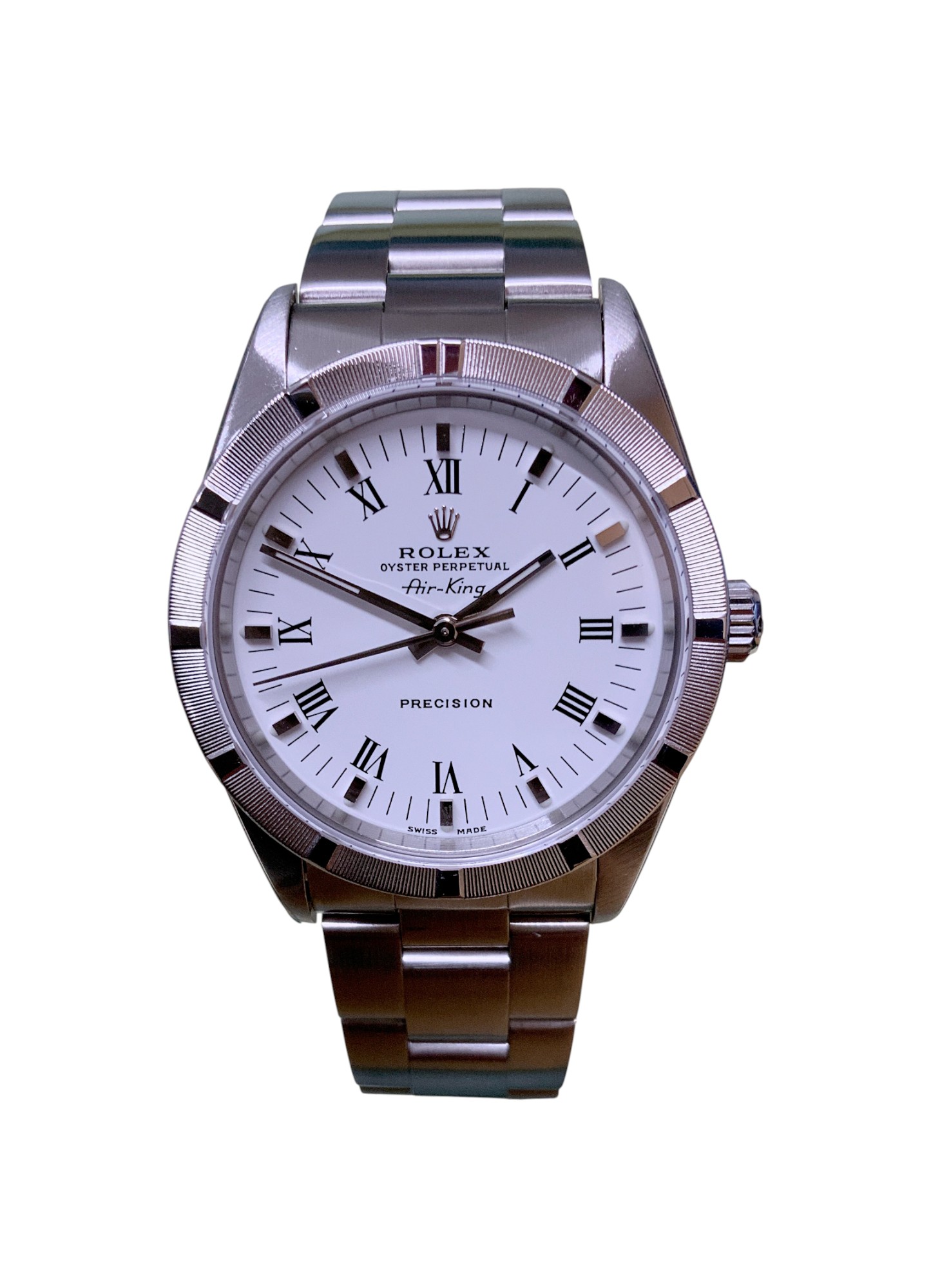 This Rolex Air-King 14000 has a white roman numeral dial and a bracelet strap. This Rolex has undergone a thorough inspection of water resistance, accuracy, functionality and condition to determine the level of reconditioning required to meet our strict standards. It has also been referenced against technical documents and manufacturer records where available to ensure authenticity and a clean history. Our watches have a 24-month warranty for your peace of mind, in conjunction with any remaining manufacturer’s warranty from new or from service. To maintain the manufacturer’s warranty on this watch, it has not been polished in our service centre.