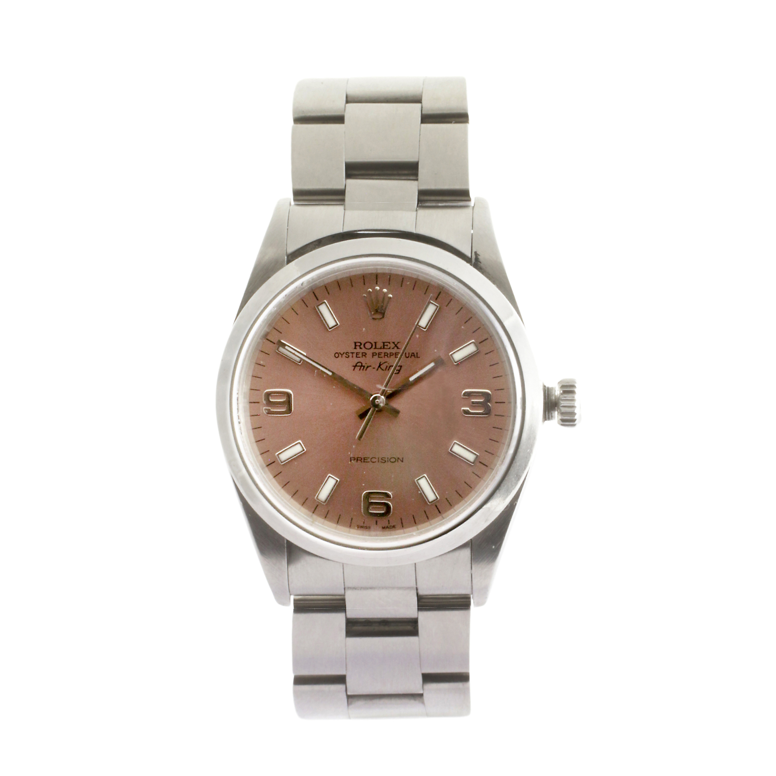 This Rolex Air-King 14000M has a salmon quarter arabic dial and a bracelet strap. This Rolex has undergone a thorough inspection of water resistance, accuracy, functionality and condition to determine the level of reconditioning required to meet our strict standards. It has also been referenced against technical documents and manufacturer records where available to ensure authenticity and a clean history. All our watches have a 24-month warranty for your peace of mind. One of our skilled polishing technicians has removed marks on the case and bracelet of this watch, brought about by daily wear and tear, which is why this watch does not come with the remaining manufacturer’s warranty.