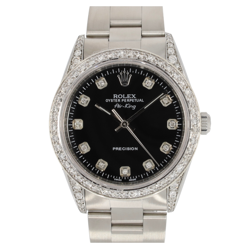 This Rolex Air-King 14010 has a black baton dial and a bracelet strap. This Rolex has undergone a thorough inspection of water resistance, accuracy, functionality and condition to determine the level of reconditioning required to meet our strict standards. It has also been referenced against technical documents and manufacturer records where available to ensure authenticity and a clean history. All our watches have a 24-month warranty for your peace of mind. One of our skilled polishing technicians has removed marks on the case and bracelet of this watch, brought about by daily wear and tear, which is why this watch does not come with the remaining manufacturer’s warranty.