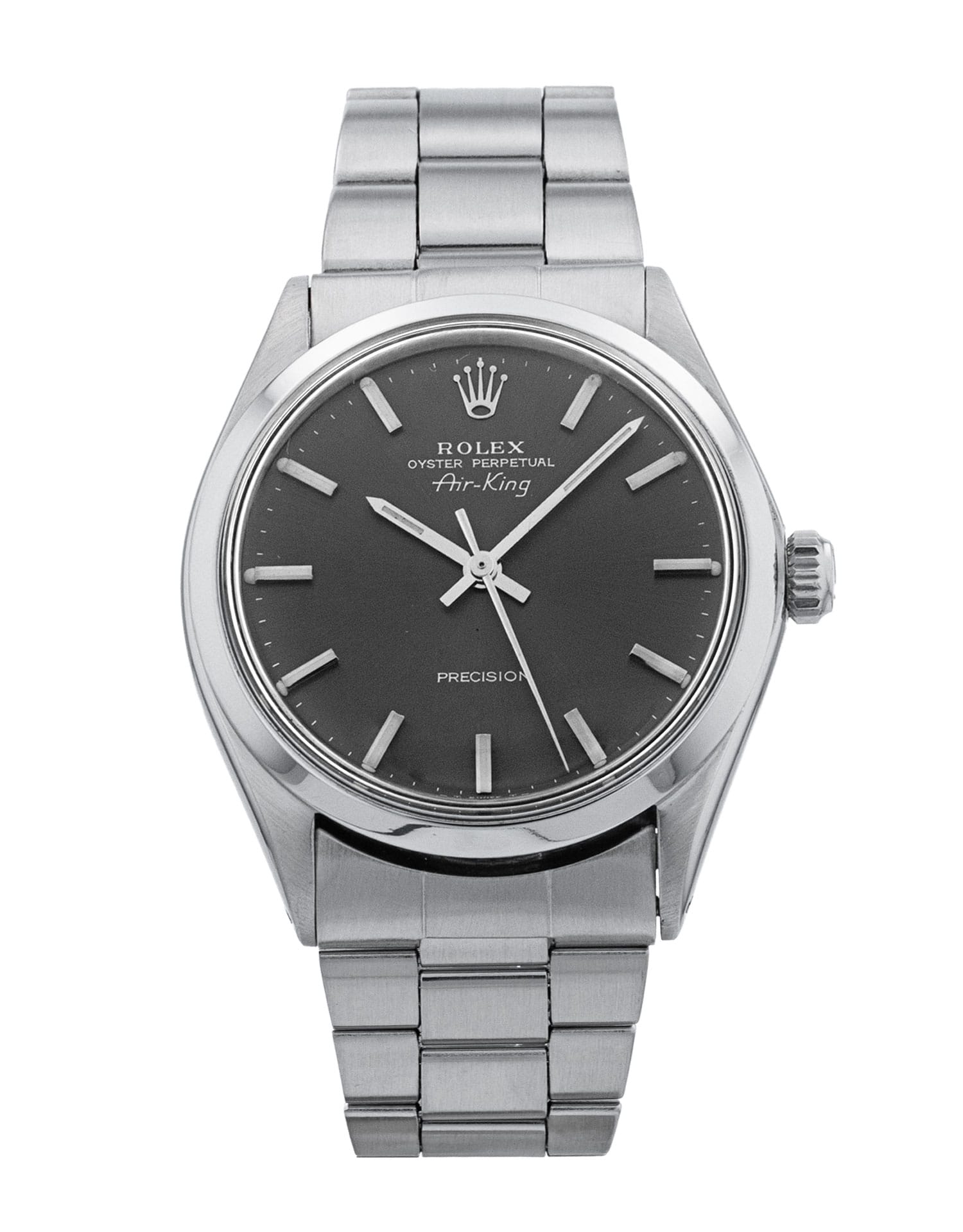 This Rolex Air-King 5500 has a grey baton dial and a bracelet strap. Due to age, this Rolex may not fall within our typical expected tolerances for timekeeping, and is no longer suitable for use in wet environments or submersion in water. In the interests of preserving original features, utmost care has been taken to sympathetically restore this watch. It has also been referenced against technical documents and manufacturer records where available to ensure authenticity and a clean history. One of our skilled polishing technicians has removed marks on the case and bracelet of this watch, brought about by daily wear and tear, which is why this watch does not come with the remaining manufacturer’s warranty.