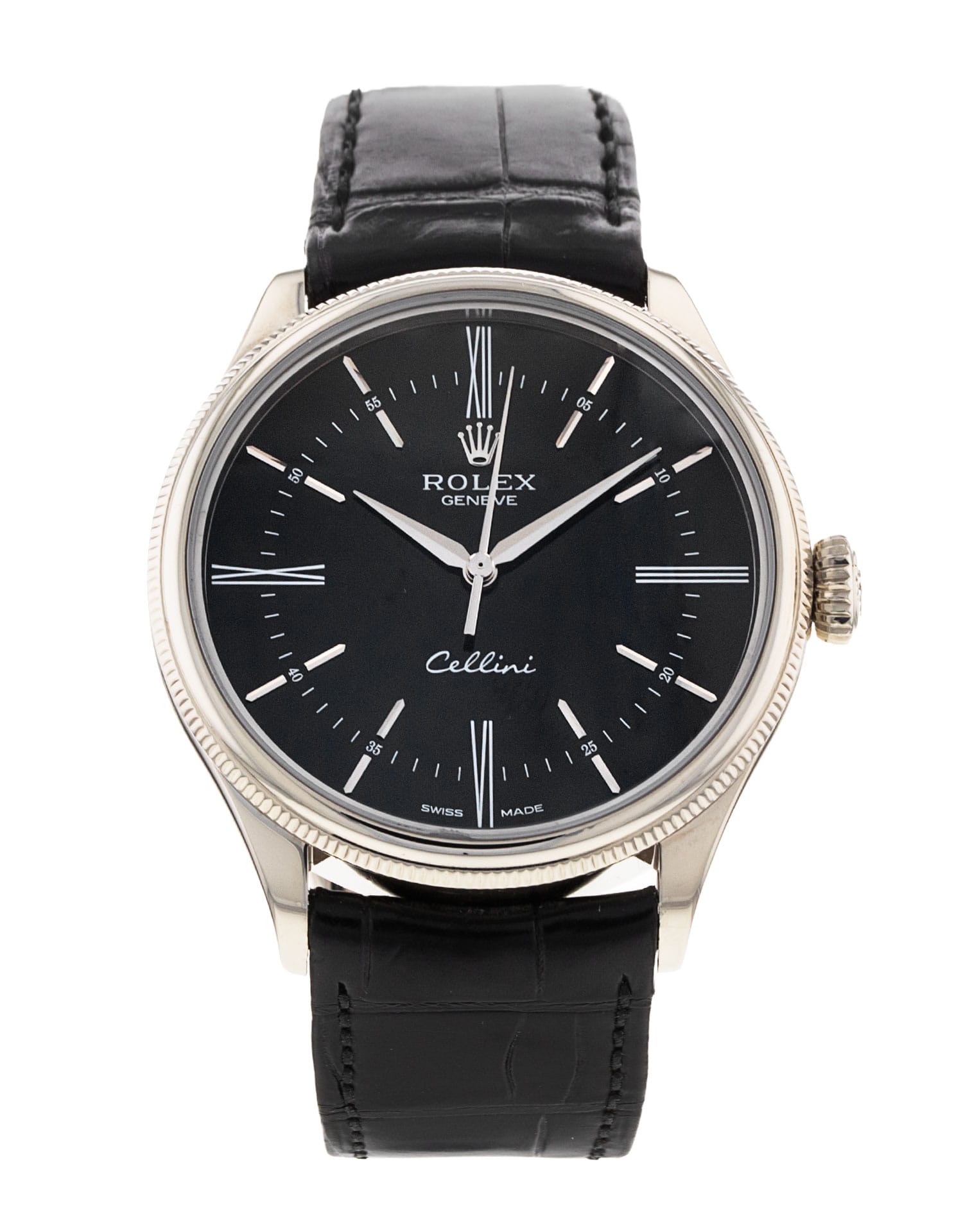 This Rolex Cellini 50509 has a black quarter roman numeral dial and a leather strap. This Rolex has undergone a thorough inspection of water resistance, accuracy, functionality and condition to determine the level of reconditioning required to meet our strict standards. It has also been referenced against technical documents and manufacturer records where available to ensure authenticity and a clean history. All our watches have a 24-month warranty for your peace of mind. One of our skilled polishing technicians has removed marks on the case and bracelet of this watch, brought about by daily wear and tear, which is why this watch does not come with the remaining manufacturer’s warranty.