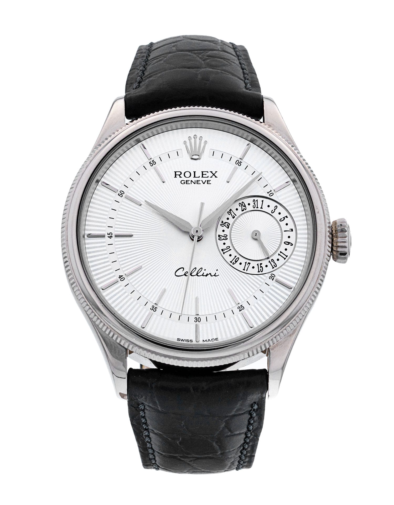 This Rolex Cellini 50519 has a silver dial and a leather strap. This Rolex has undergone a thorough inspection of water resistance, accuracy, functionality and condition to determine the level of reconditioning required to meet our strict standards. It has also been referenced against technical documents and manufacturer records where available to ensure authenticity and a clean history. All our watches have a 24-month warranty for your peace of mind. One of our skilled polishing technicians has removed marks on the case and bracelet of this watch, brought about by daily wear and tear, which is why this watch does not come with the remaining manufacturer’s warranty.