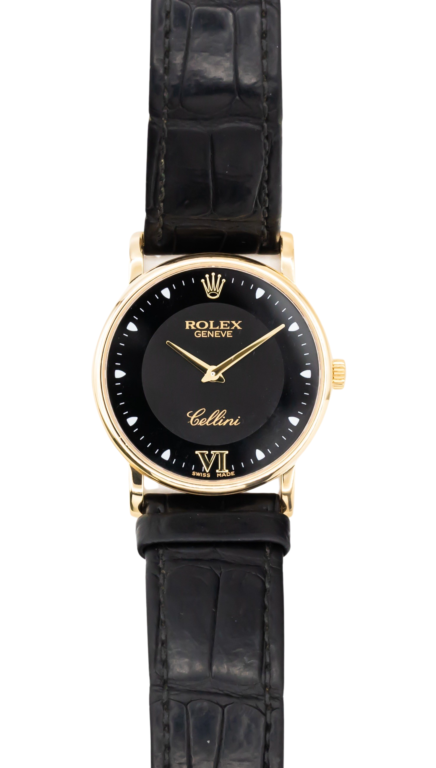 This Rolex Cellini 5115/8 has a black baton dial and a leather strap. This Rolex has undergone a thorough inspection of water resistance, accuracy, functionality and condition to determine the level of reconditioning required to meet our strict standards. It has also been referenced against technical documents and manufacturer records where available to ensure authenticity and a clean history. All our watches have a 24-month warranty for your peace of mind. One of our skilled polishing technicians has removed marks on the case and bracelet of this watch, brought about by daily wear and tear, which is why this watch does not come with the remaining manufacturer’s warranty.