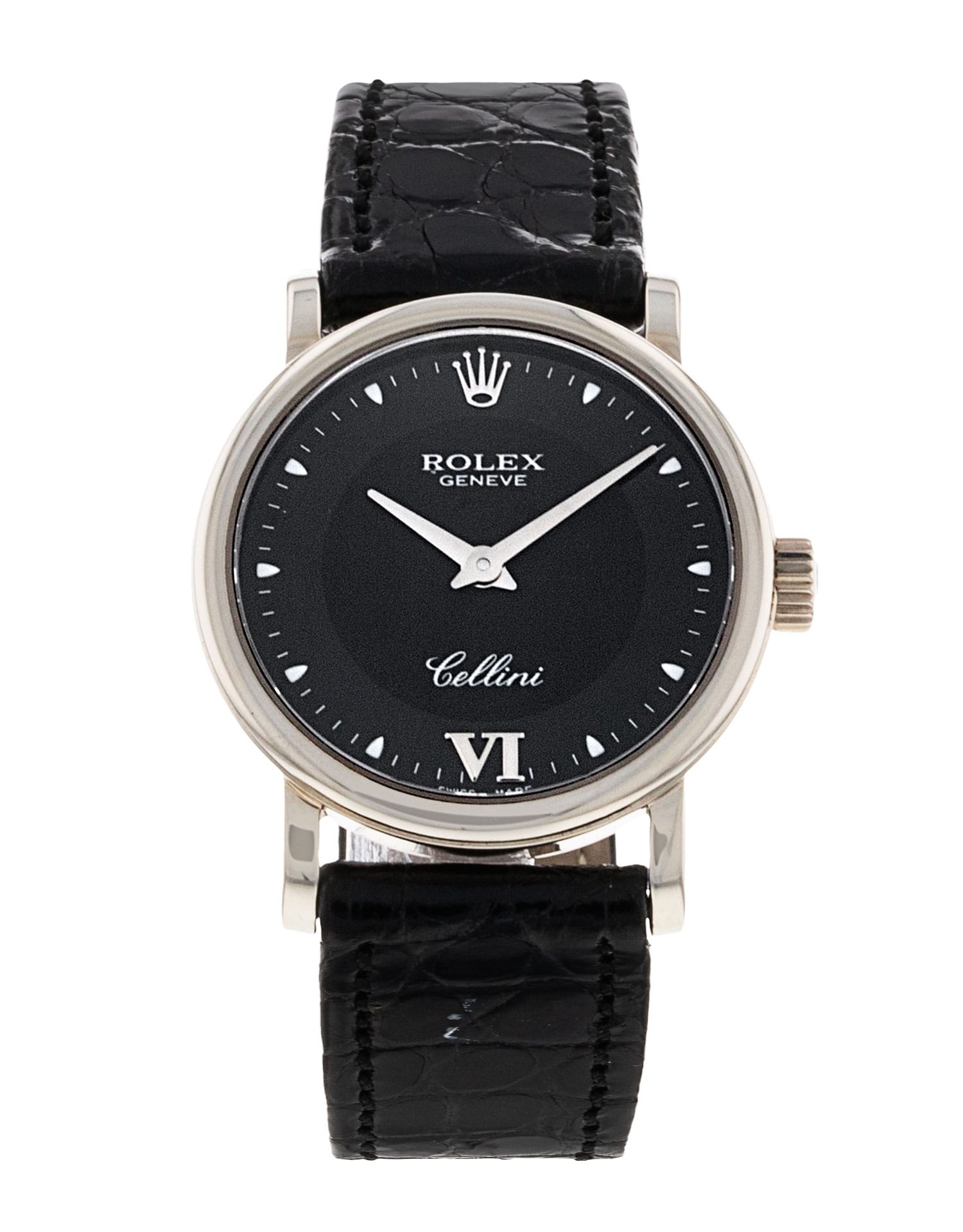 This Rolex Cellini 6110 has a black dial and a leather strap. This Rolex has undergone a thorough inspection of water resistance, accuracy, functionality and condition to determine the level of reconditioning required to meet our strict standards. It has also been referenced against technical documents and manufacturer records where available to ensure authenticity and a clean history. All our watches have a 24-month warranty for your peace of mind. One of our skilled polishing technicians has removed marks on the case and bracelet of this watch, brought about by daily wear and tear, which is why this watch does not come with the remaining manufacturer’s warranty.