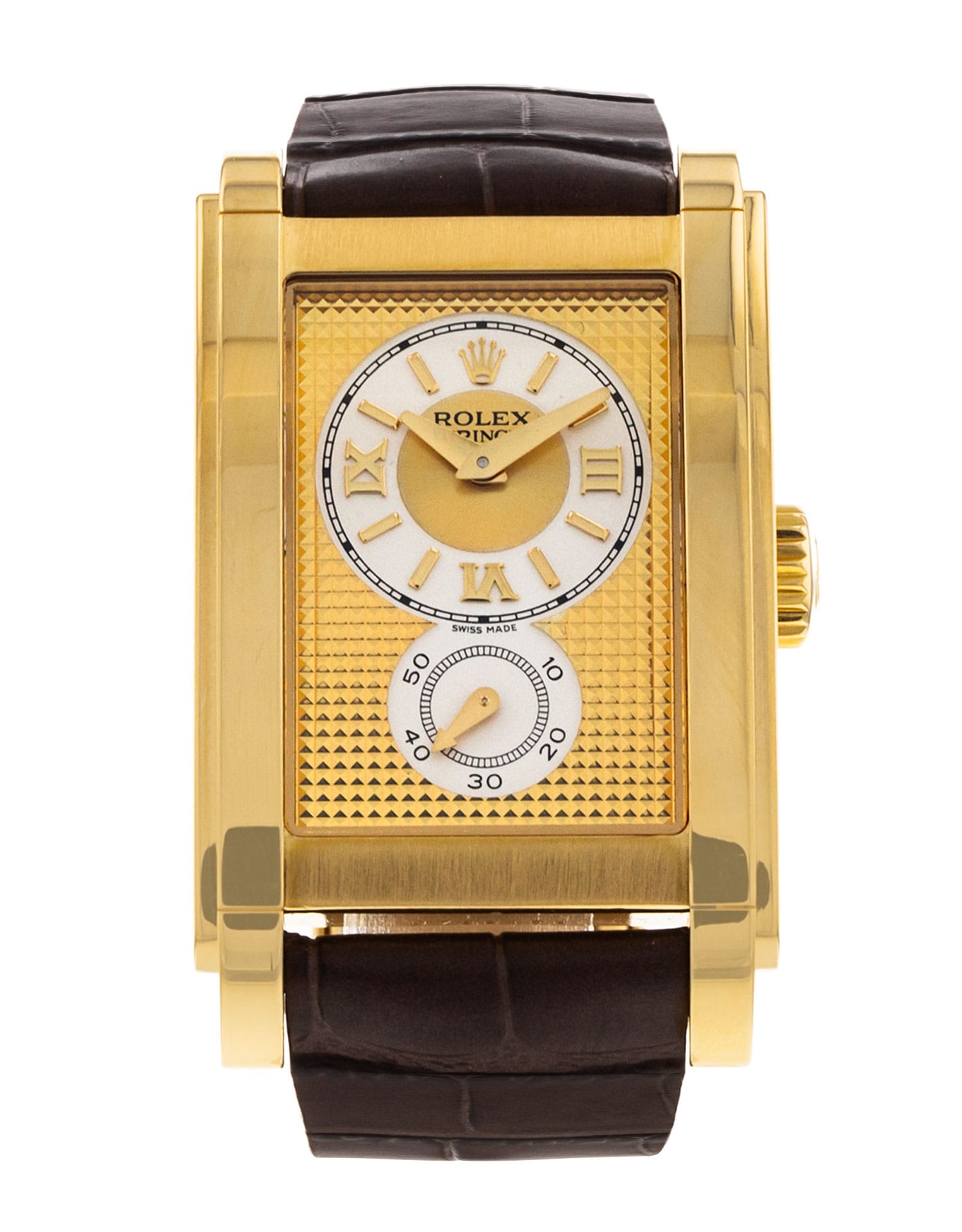 This Rolex Cellini 5440/8 has a champagne roman numeral dial and a leather strap. This Rolex has undergone a thorough inspection of water resistance, accuracy, functionality and condition to determine the level of reconditioning required to meet our strict standards. It has also been referenced against technical documents and manufacturer records where available to ensure authenticity and a clean history. All our watches have a 24-month warranty for your peace of mind. One of our skilled polishing technicians has removed marks on the case and bracelet of this watch, brought about by daily wear and tear, which is why this watch does not come with the remaining manufacturer’s warranty.