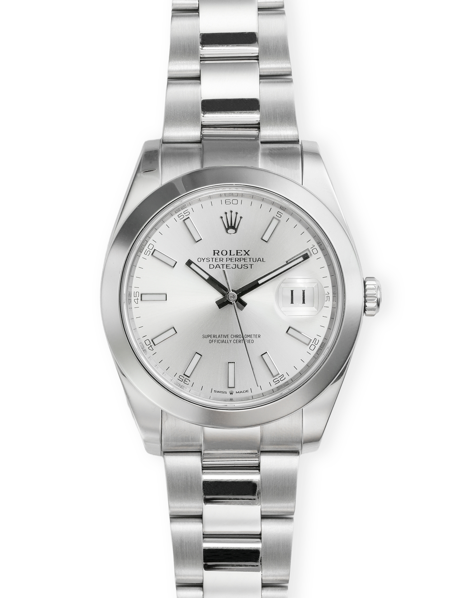 This Rolex Datejust 41 126300 has a silver baton dial and a bracelet strap. This Rolex has undergone a thorough inspection of water resistance, accuracy, functionality and condition to determine the level of reconditioning required to meet our strict standards. It has also been referenced against technical documents and manufacturer records where available to ensure authenticity and a clean history. Our watches have a 24-month warranty for your peace of mind, in conjunction with any remaining manufacturer’s warranty from new or from service. To maintain the manufacturer’s warranty on this watch, it has not been polished in our service centre.