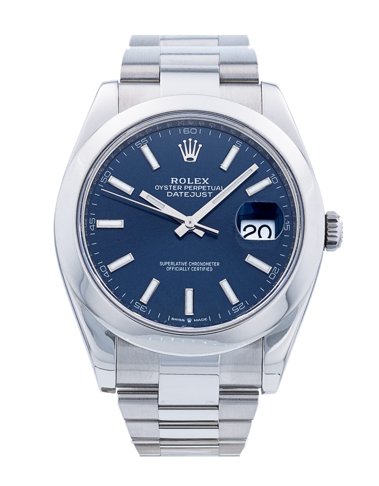 This Rolex Datejust 41 126300 has a blue baton dial and a bracelet strap. This Rolex has undergone a thorough inspection of water resistance, accuracy, functionality and condition to determine the level of reconditioning required to meet our strict standards. It has also been referenced against technical documents and manufacturer records where available to ensure authenticity and a clean history. All our watches have a 24-month warranty for your peace of mind. One of our skilled polishing technicians has removed marks on the case and bracelet of this watch, brought about by daily wear and tear, which is why this watch does not come with the remaining manufacturer’s warranty.