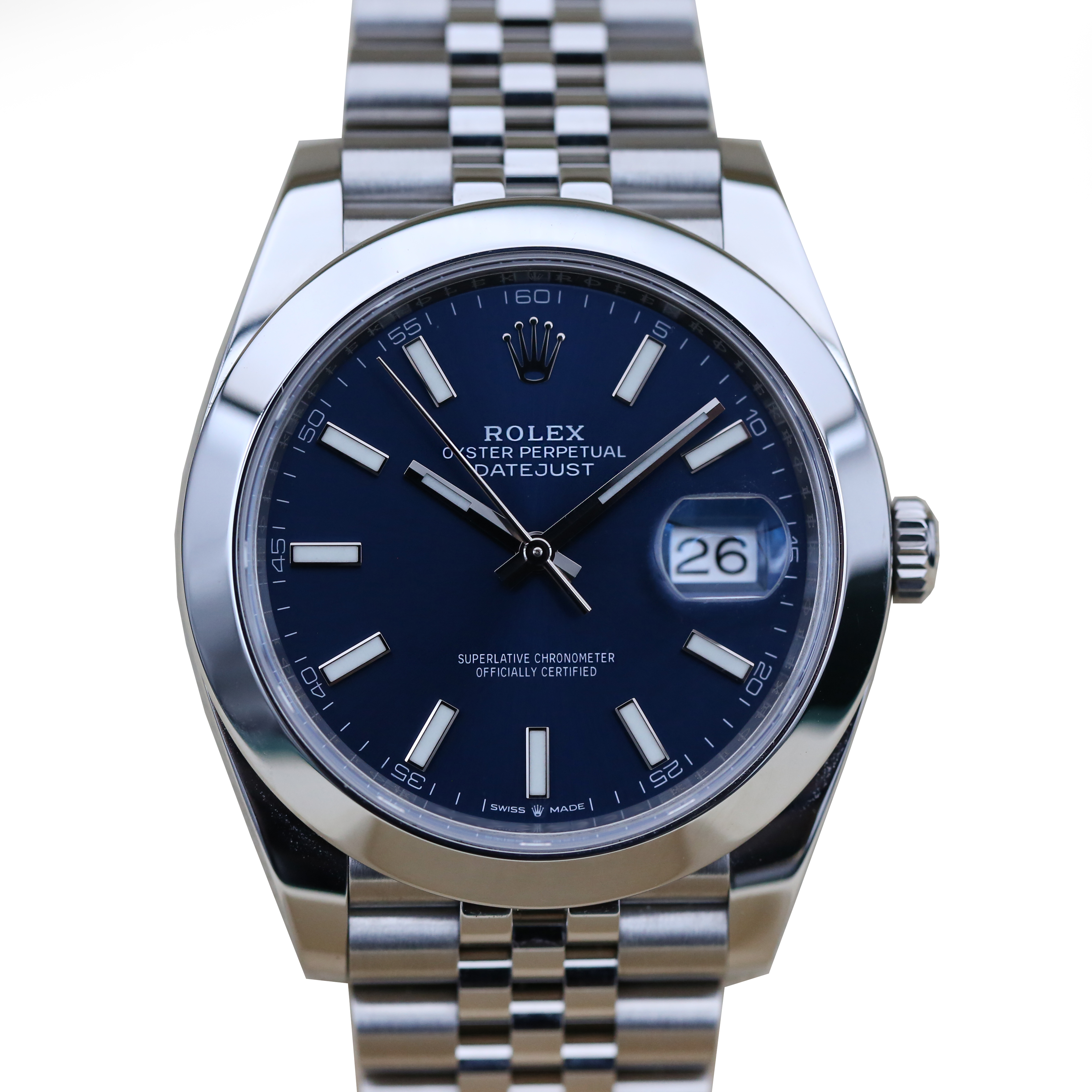 This Rolex Datejust 41 126300 has a blue baton dial and a bracelet strap. This Rolex has undergone a thorough inspection of water resistance, accuracy, functionality and condition to determine the level of reconditioning required to meet our strict standards. It has also been referenced against technical documents and manufacturer records where available to ensure authenticity and a clean history. Our watches have a 24-month warranty for your peace of mind, in conjunction with any remaining manufacturer’s warranty from new or from service. To maintain the manufacturer’s warranty on this watch, it has not been polished in our service centre.