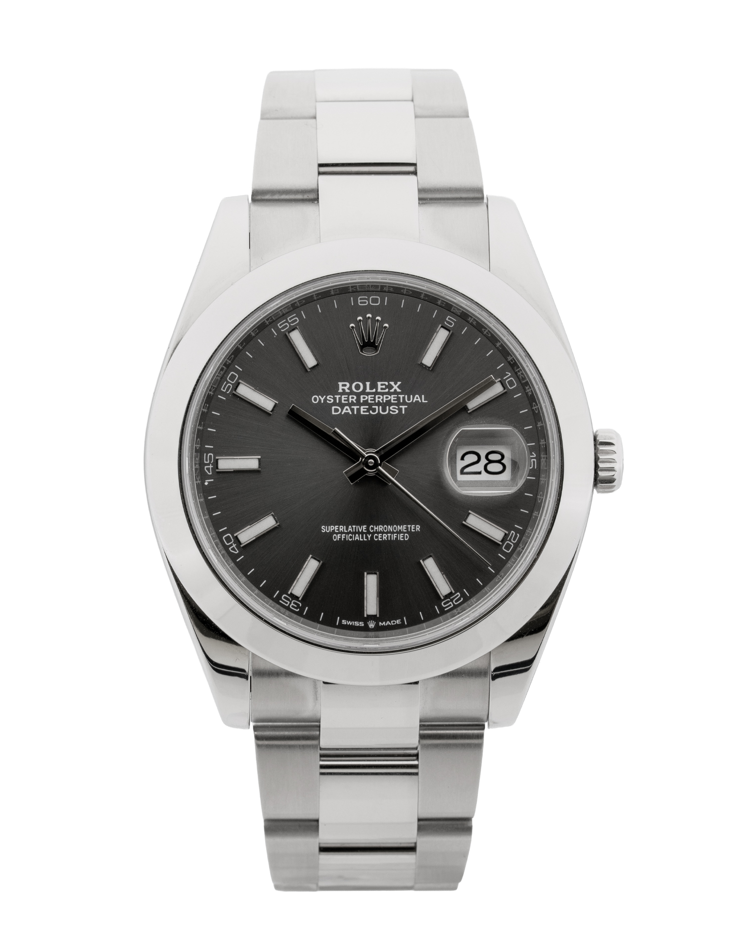 This Rolex Datejust 41 126300 has a slate baton dial and a bracelet strap. This Rolex has undergone a thorough inspection of water resistance, accuracy, functionality and condition to determine the level of reconditioning required to meet our strict standards. It has also been referenced against technical documents and manufacturer records where available to ensure authenticity and a clean history. All our watches have a 24-month warranty for your peace of mind. One of our skilled polishing technicians has removed marks on the case and bracelet of this watch, brought about by daily wear and tear, which is why this watch does not come with the remaining manufacturer’s warranty.