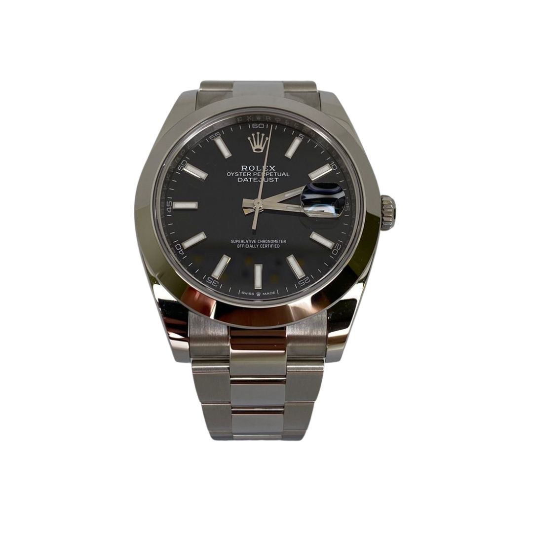 This Rolex Datejust 41 126300 has a black baton dial and a bracelet strap. This Rolex has undergone a thorough inspection of water resistance, accuracy, functionality and condition to determine the level of reconditioning required to meet our strict standards. It has also been referenced against technical documents and manufacturer records where available to ensure authenticity and a clean history. Our watches have a 24-month warranty for your peace of mind, in conjunction with any remaining manufacturer’s warranty from new or from service. To maintain the manufacturer’s warranty on this watch, it has not been polished in our service centre.