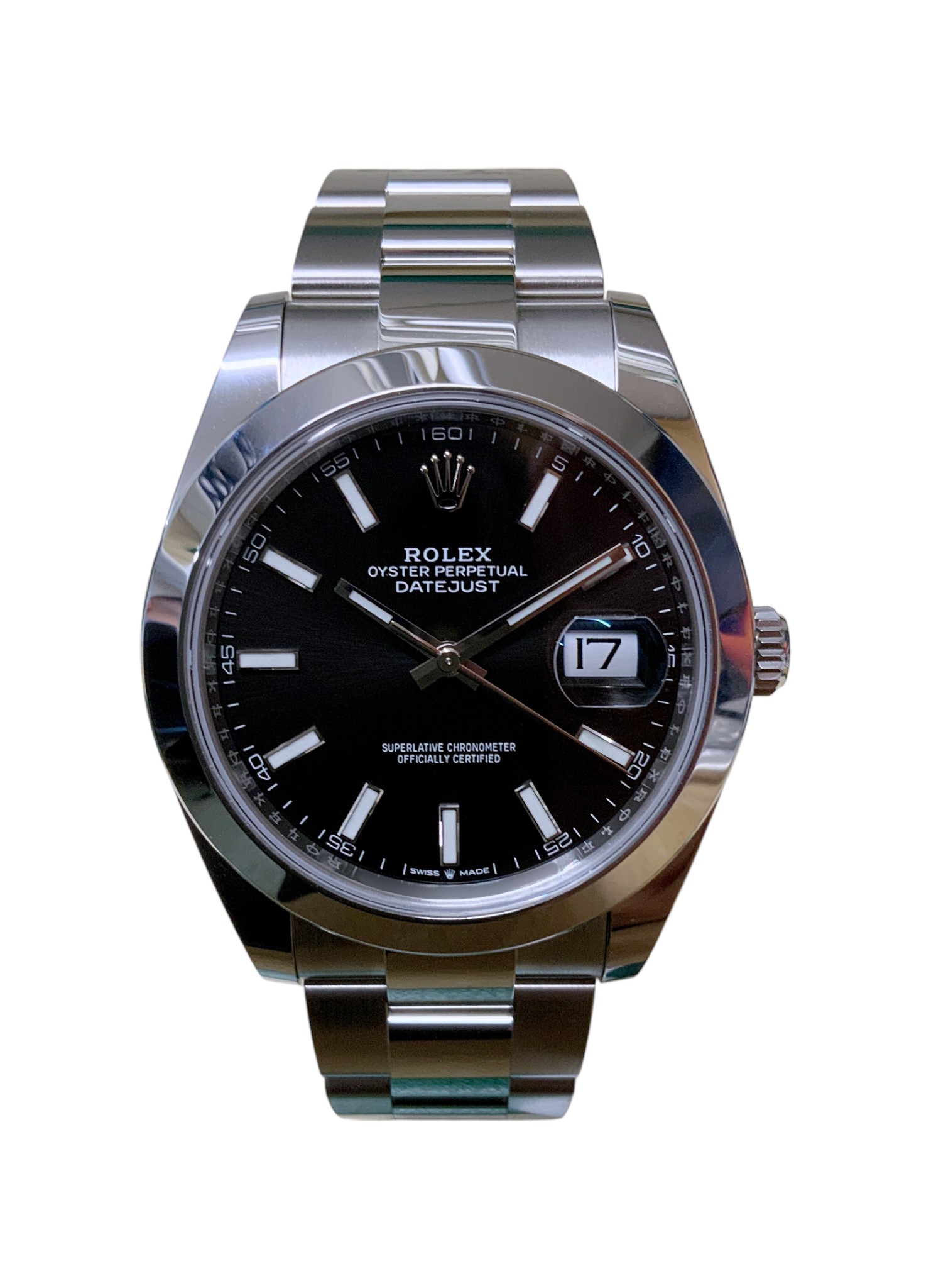 This Rolex Datejust 41 126300 has a black baton dial and a bracelet strap. This Rolex has undergone a thorough inspection of water resistance, accuracy, functionality and condition to determine the level of reconditioning required to meet our strict standards. It has also been referenced against technical documents and manufacturer records where available to ensure authenticity and a clean history. Our watches have a 24-month warranty for your peace of mind, in conjunction with any remaining manufacturer’s warranty from new or from service. To maintain the manufacturer’s warranty on this watch, it has not been polished in our service centre.