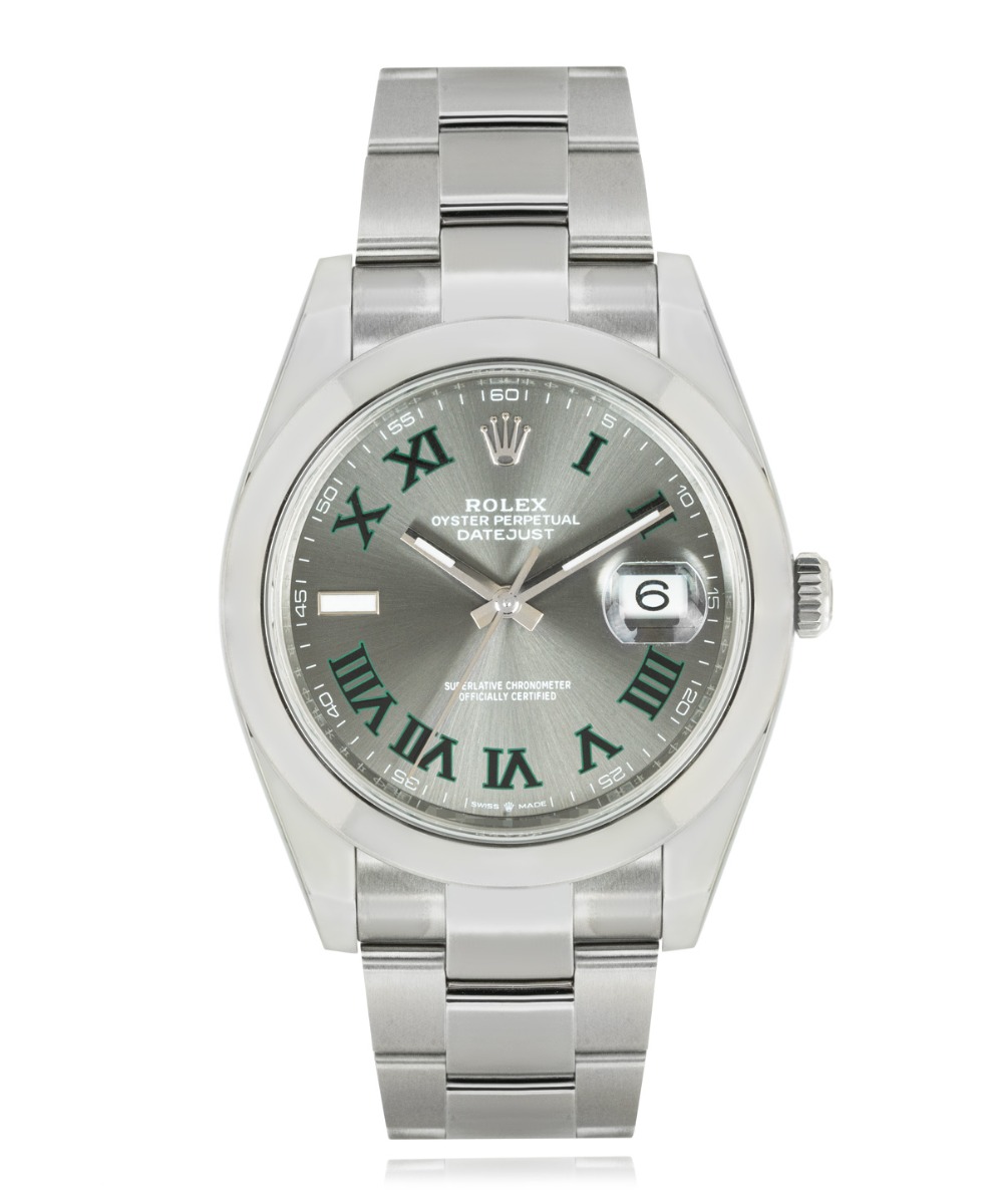 This Rolex Datejust 41 126300 has a slate roman numeral dial and a bracelet strap. This Rolex has undergone a thorough inspection of water resistance, accuracy, functionality and condition to determine the level of reconditioning required to meet our strict standards. It has also been referenced against technical documents and manufacturer records where available to ensure authenticity and a clean history. Our watches have a 24-month warranty for your peace of mind, in conjunction with any remaining manufacturer’s warranty from new or from service. To maintain the manufacturer’s warranty on this watch, it has not been polished in our service centre.