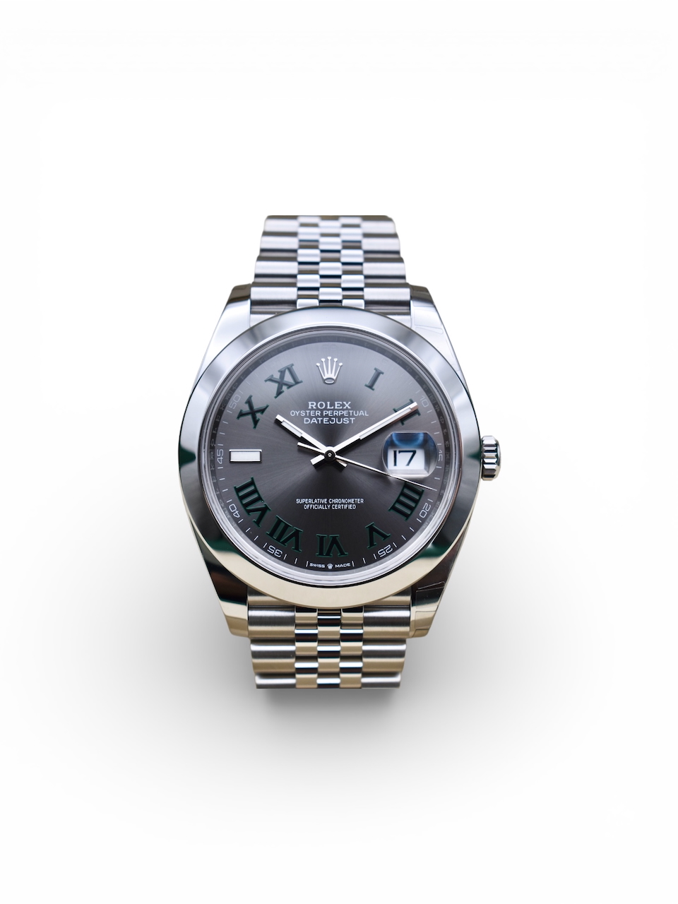 This Rolex Datejust 41 126300 has a slate roman numeral dial and a bracelet strap. This Rolex has undergone a thorough inspection of water resistance, accuracy, functionality and condition to determine the level of reconditioning required to meet our strict standards. It has also been referenced against technical documents and manufacturer records where available to ensure authenticity and a clean history. Our watches have a 24-month warranty for your peace of mind, in conjunction with any remaining manufacturer’s warranty from new or from service. To maintain the manufacturer’s warranty on this watch, it has not been polished in our service centre.