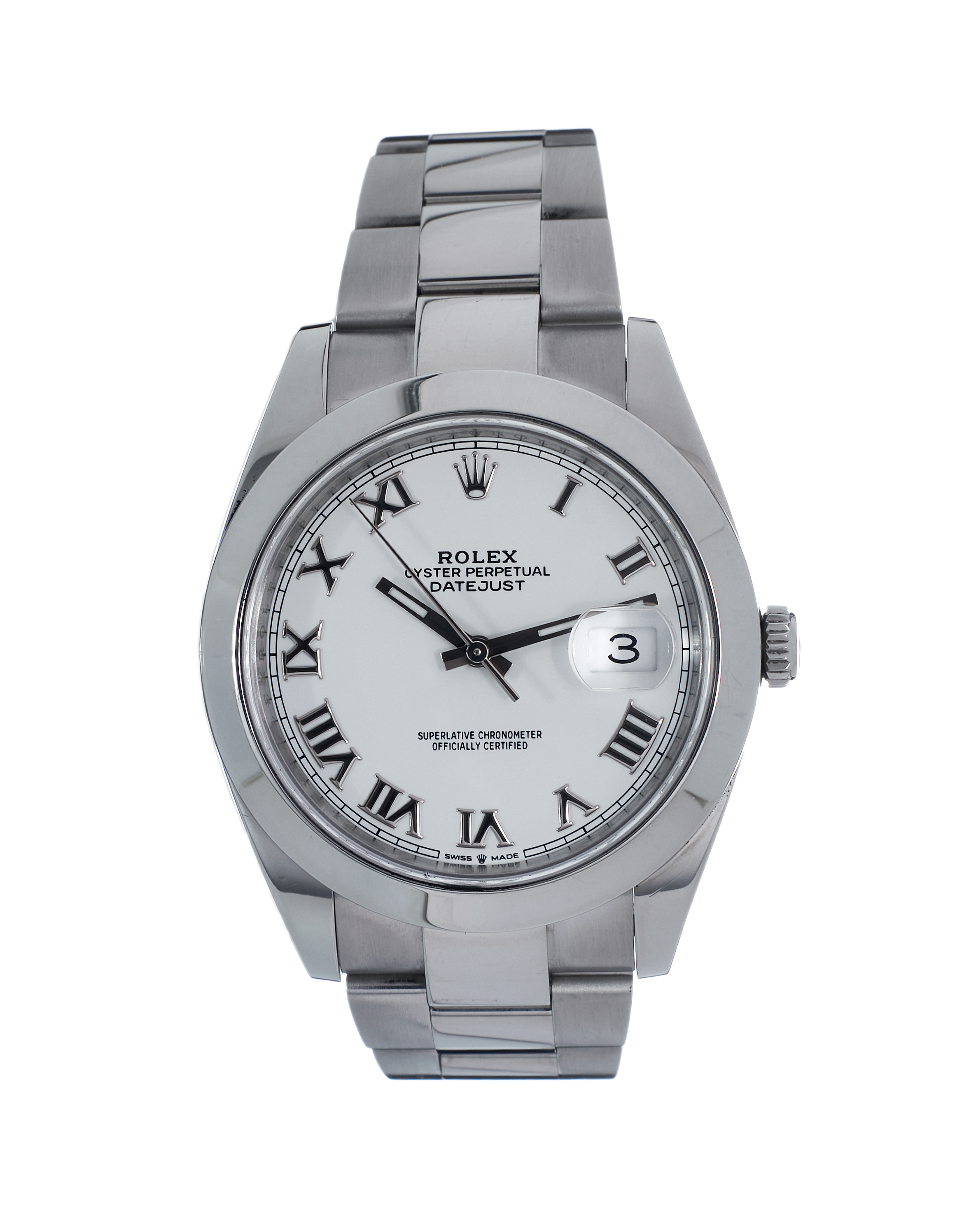 This Rolex Datejust 41 126300 has a white roman numeral dial and a bracelet strap. This Rolex has undergone a thorough inspection of water resistance, accuracy, functionality and condition to determine the level of reconditioning required to meet our strict standards. It has also been referenced against technical documents and manufacturer records where available to ensure authenticity and a clean history. All our watches have a 24-month warranty for your peace of mind. One of our skilled polishing technicians has removed marks on the case and bracelet of this watch, brought about by daily wear and tear, which is why this watch does not come with the remaining manufacturer’s warranty.