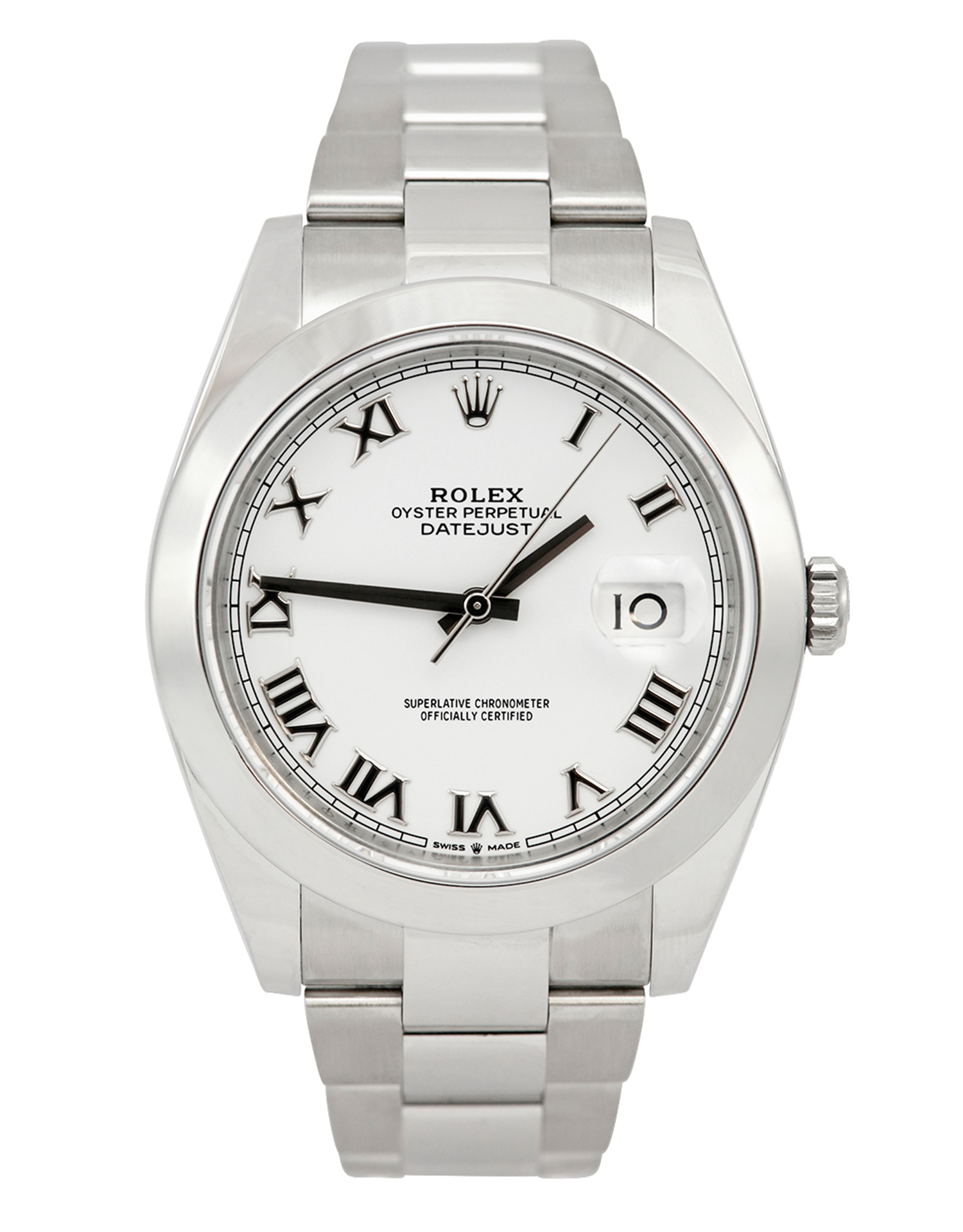 This Rolex Datejust 41 126300 has a white roman numeral dial and a bracelet strap. This Rolex has undergone a thorough inspection of water resistance, accuracy, functionality and condition to determine the level of reconditioning required to meet our strict standards. It has also been referenced against technical documents and manufacturer records where available to ensure authenticity and a clean history. All our watches have a 24-month warranty for your peace of mind. One of our skilled polishing technicians has removed marks on the case and bracelet of this watch, brought about by daily wear and tear, which is why this watch does not come with the remaining manufacturer’s warranty.