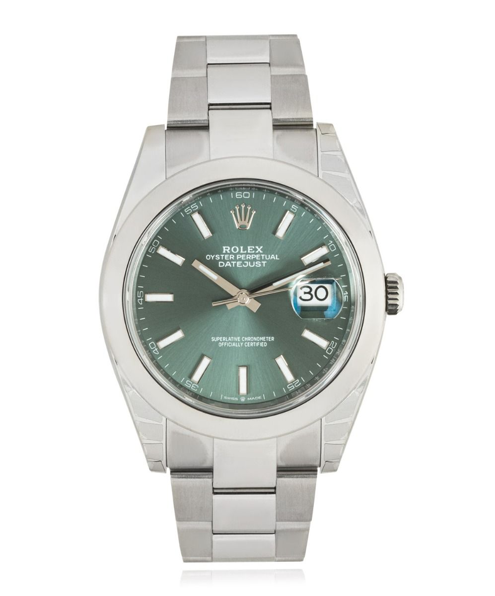This Rolex Datejust 41 126300 has a mint green baton dial and a bracelet strap. This Rolex has undergone a thorough inspection of water resistance, accuracy, functionality and condition to determine the level of reconditioning required to meet our strict standards. It has also been referenced against technical documents and manufacturer records where available to ensure authenticity and a clean history. Our watches have a 24-month warranty for your peace of mind, in conjunction with any remaining manufacturer’s warranty from new or from service. To maintain the manufacturer’s warranty on this watch, it has not been polished in our service centre.