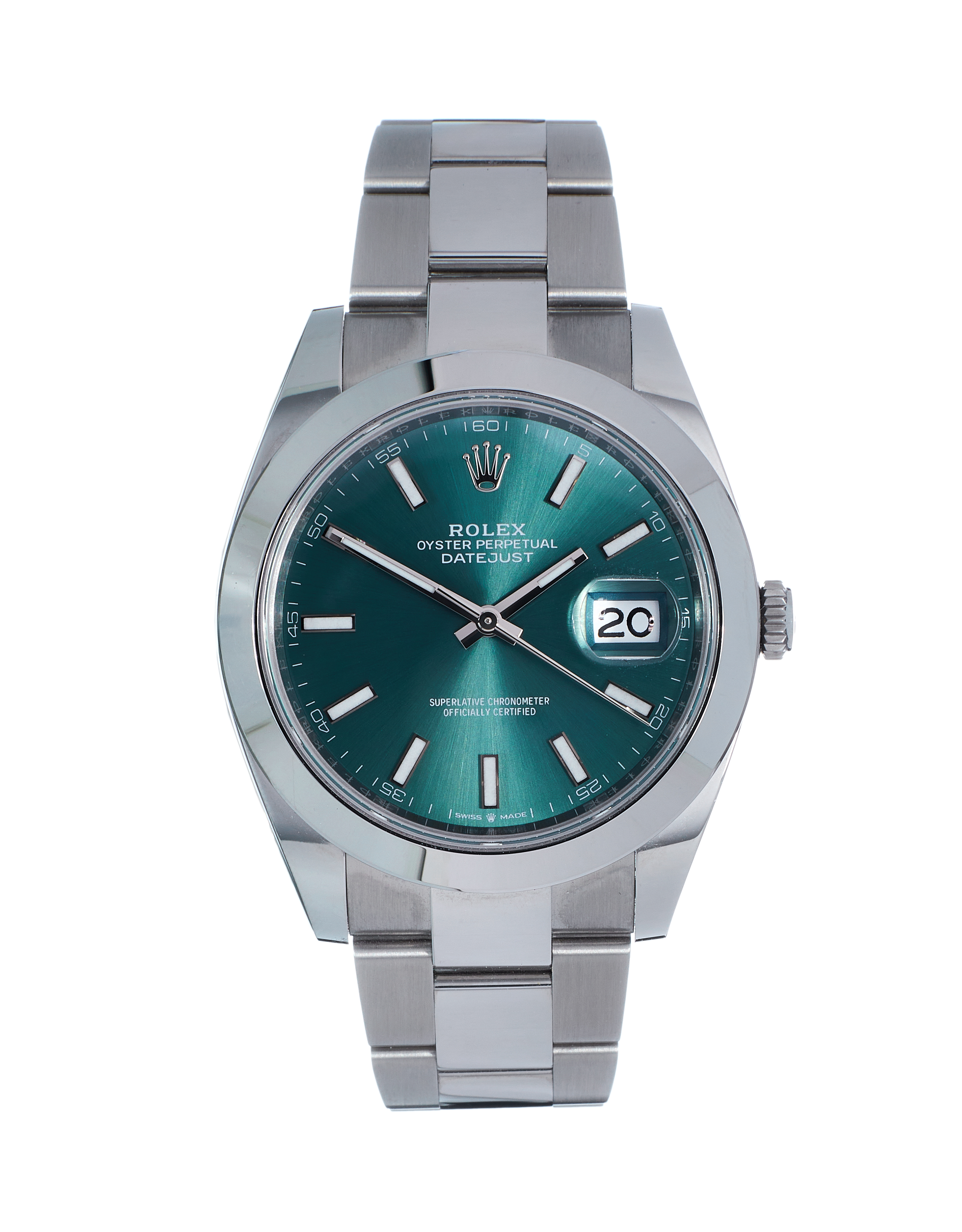 This Rolex Datejust 41 126300 has a mint green baton dial and a bracelet strap. This Rolex has undergone a thorough inspection of water resistance, accuracy, functionality and condition to determine the level of reconditioning required to meet our strict standards. It has also been referenced against technical documents and manufacturer records where available to ensure authenticity and a clean history. Our watches have a 24-month warranty for your peace of mind, in conjunction with any remaining manufacturer’s warranty from new or from service. To maintain the manufacturer’s warranty on this watch, it has not been polished in our service centre.