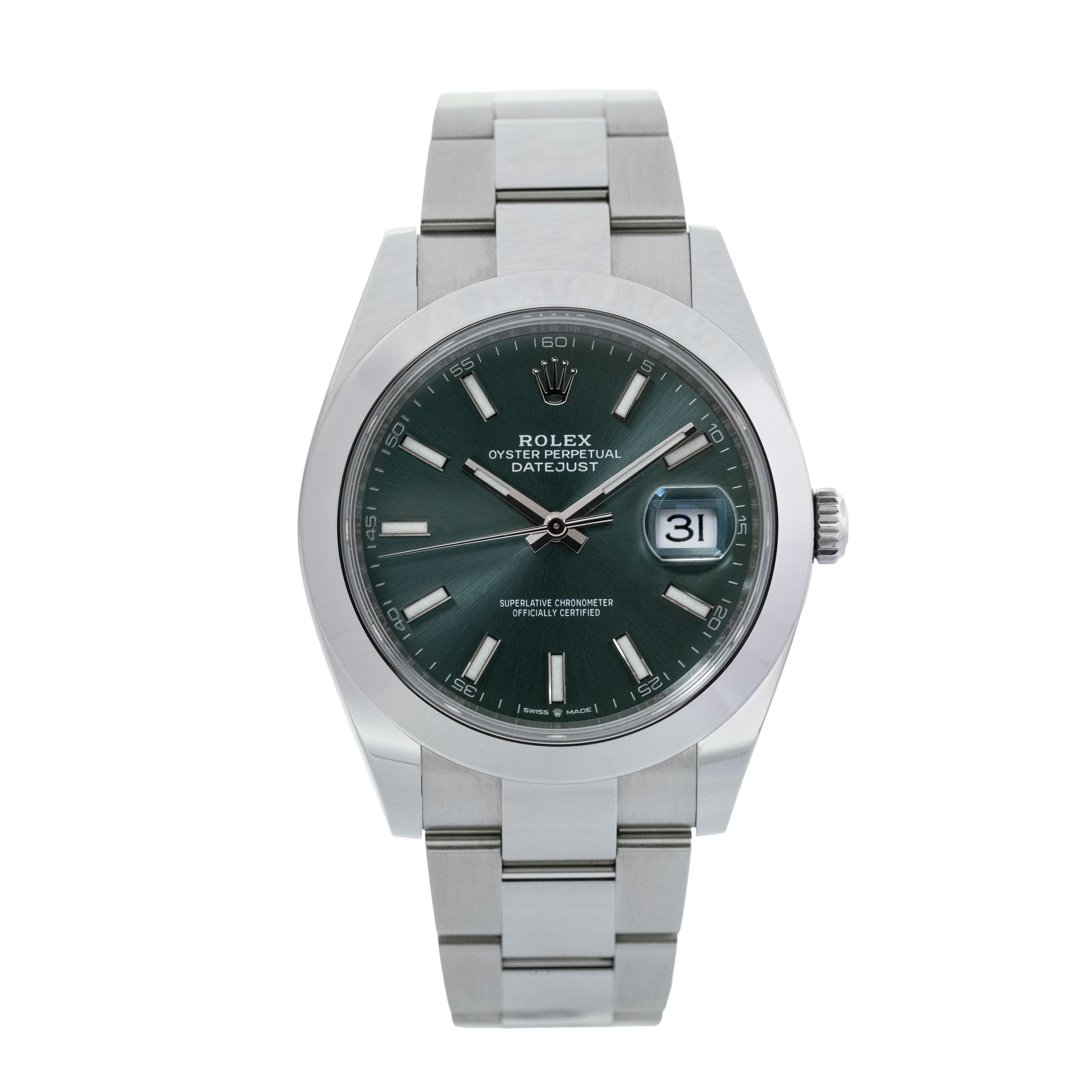 This Rolex Datejust 41 126300 has a mint green baton dial and a bracelet strap. This Rolex has undergone a thorough inspection of water resistance, accuracy, functionality and condition to determine the level of reconditioning required to meet our strict standards. It has also been referenced against technical documents and manufacturer records where available to ensure authenticity and a clean history. Our watches have a 24-month warranty for your peace of mind, in conjunction with any remaining manufacturer’s warranty from new or from service. To maintain the manufacturer’s warranty on this watch, it has not been polished in our service centre.