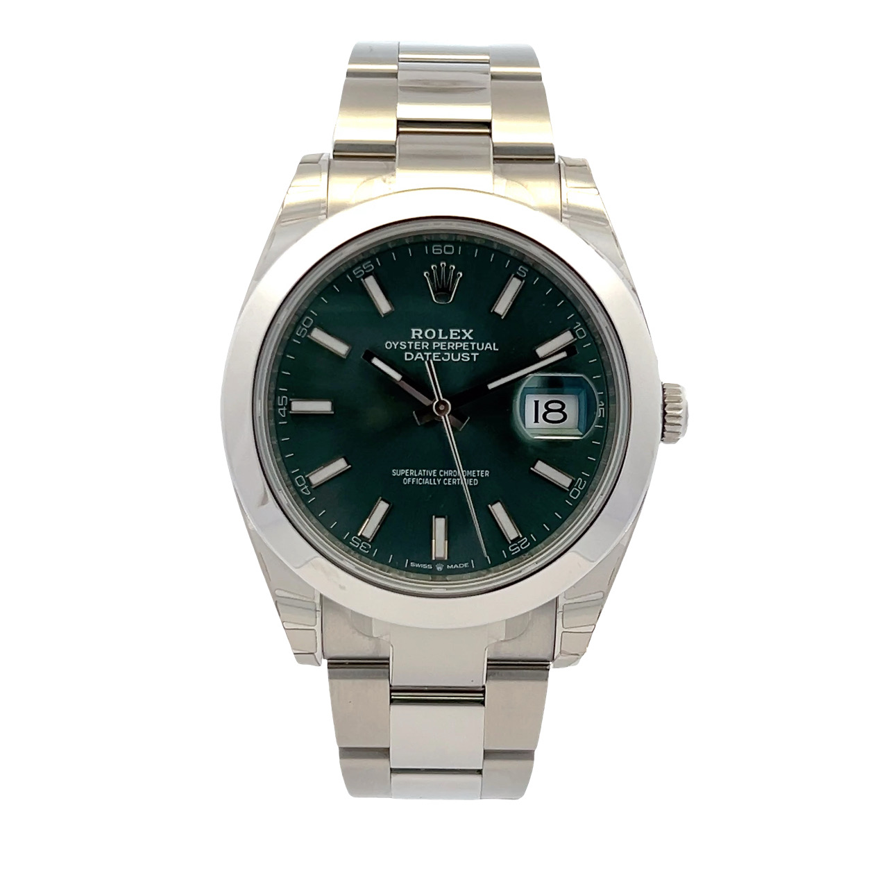This Rolex Datejust 41 126300 has a mint green baton dial and a bracelet strap. This Rolex has undergone a thorough inspection of water resistance, accuracy, functionality and condition to determine the level of reconditioning required to meet our strict standards. It has also been referenced against technical documents and manufacturer records where available to ensure authenticity and a clean history. Our watches have a 24-month warranty for your peace of mind, in conjunction with any remaining manufacturer’s warranty from new or from service. To maintain the manufacturer’s warranty on this watch, it has not been polished in our service centre.