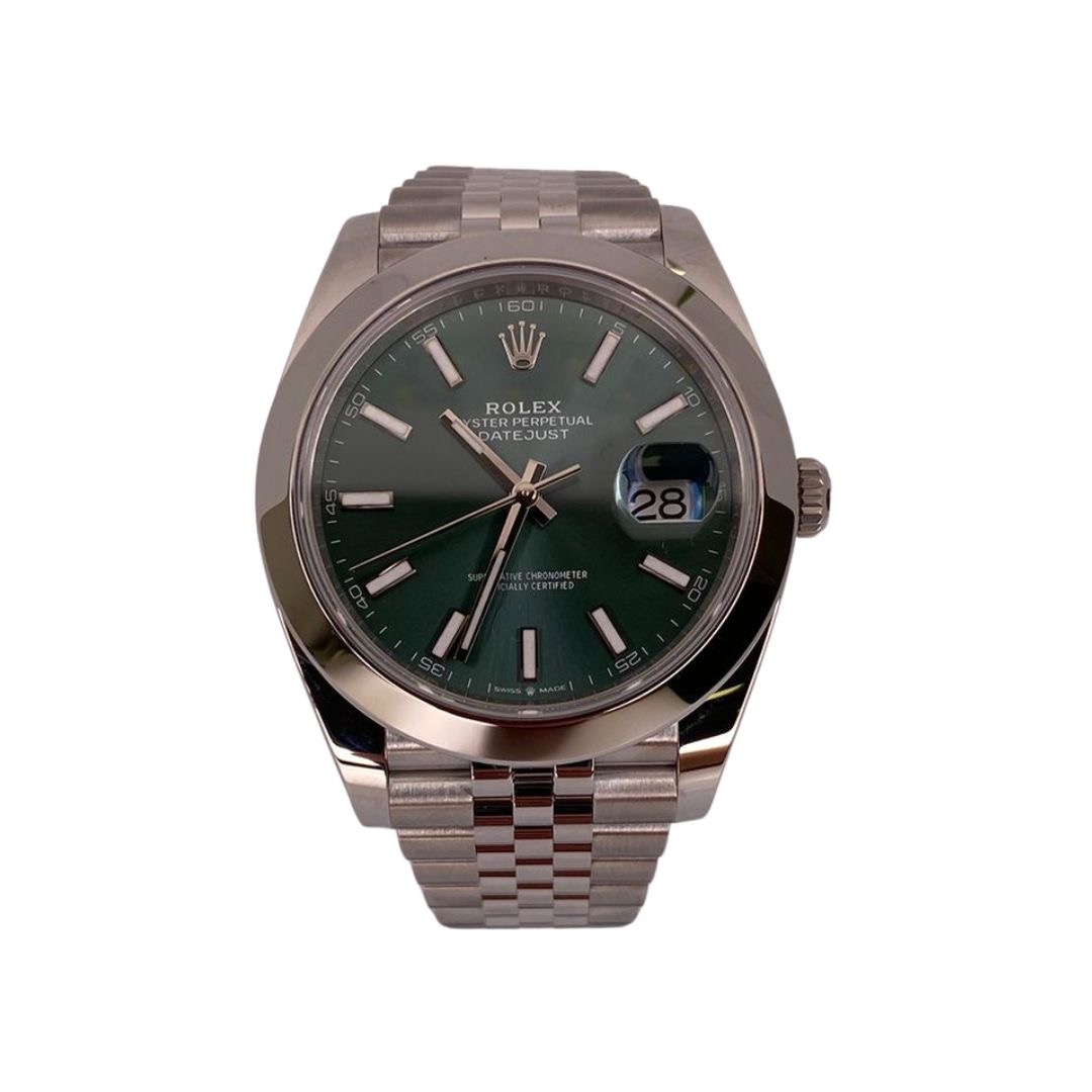 This Rolex Datejust 41 126300 has a mint green baton dial and a bracelet strap. This Rolex has undergone a thorough inspection of water resistance, accuracy, functionality and condition to determine the level of reconditioning required to meet our strict standards. It has also been referenced against technical documents and manufacturer records where available to ensure authenticity and a clean history. Our watches have a 24-month warranty for your peace of mind, in conjunction with any remaining manufacturer’s warranty from new or from service. To maintain the manufacturer’s warranty on this watch, it has not been polished in our service centre.