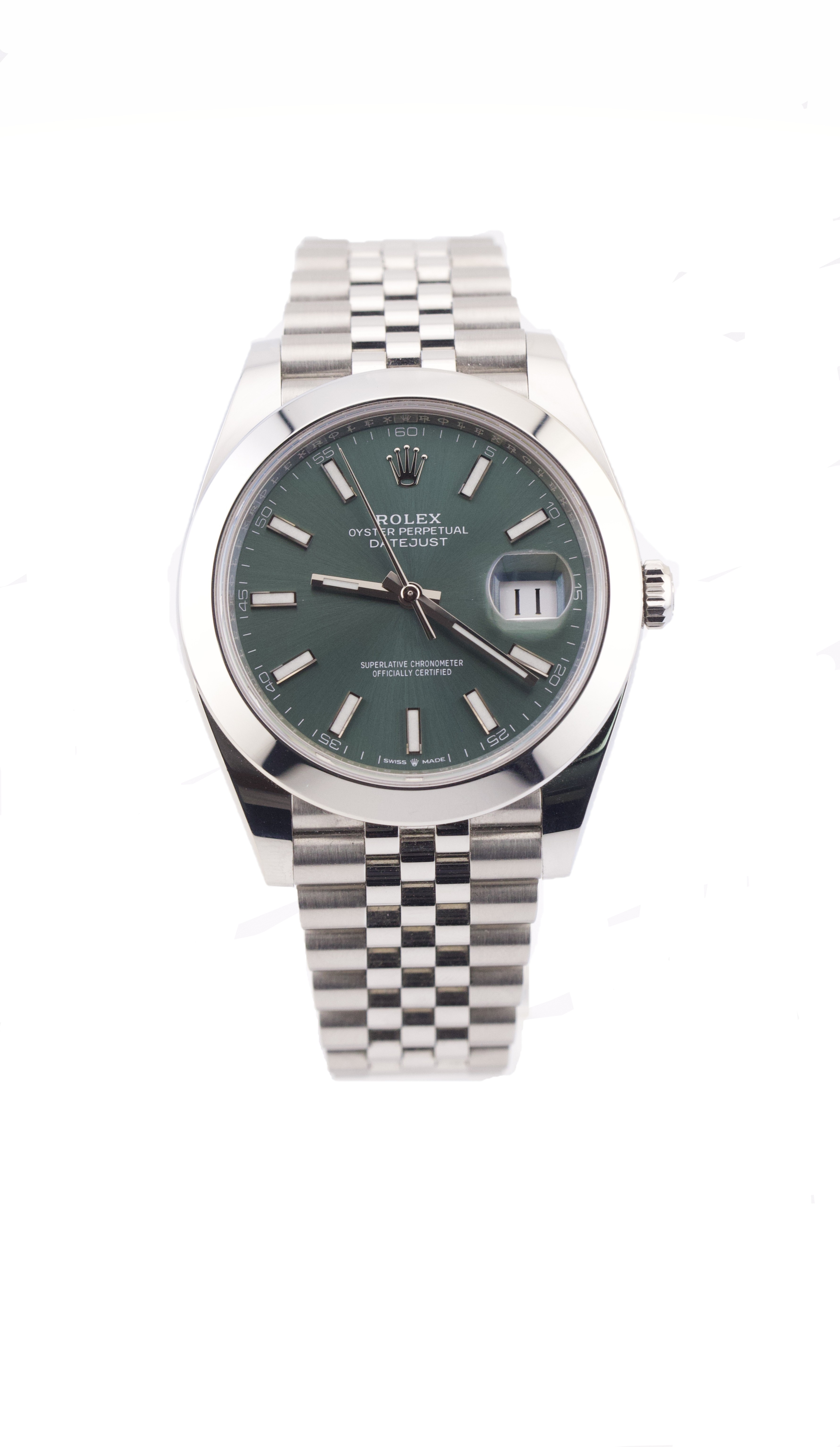 This Rolex Datejust 41 126300 has a mint green baton dial and a bracelet strap. This Rolex has undergone a thorough inspection of water resistance, accuracy, functionality and condition to determine the level of reconditioning required to meet our strict standards. It has also been referenced against technical documents and manufacturer records where available to ensure authenticity and a clean history. Our watches have a 24-month warranty for your peace of mind, in conjunction with any remaining manufacturer’s warranty from new or from service. To maintain the manufacturer’s warranty on this watch, it has not been polished in our service centre.