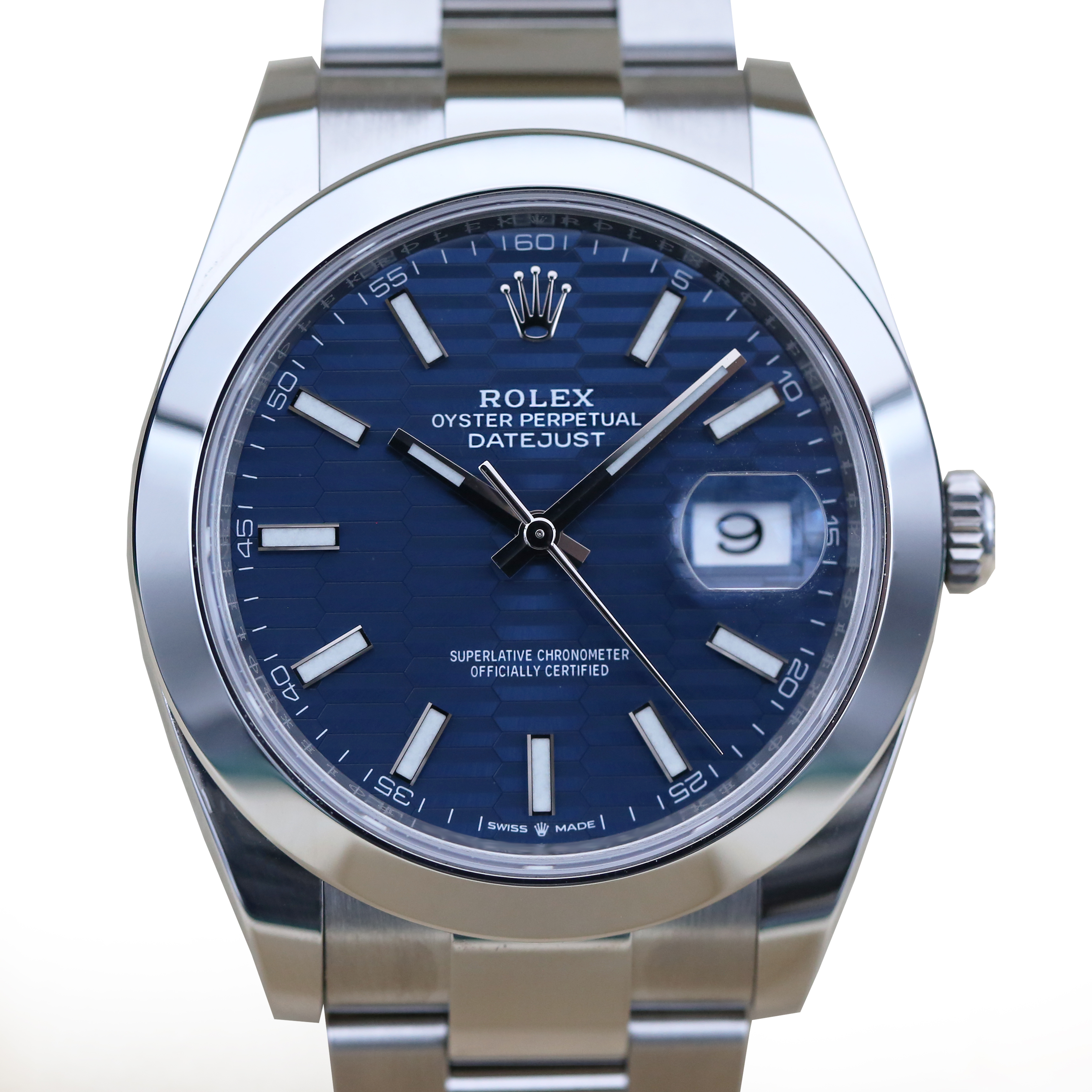 This Rolex Datejust 41 126300 has a blue fluted motif dial and a bracelet strap. This Rolex has undergone a thorough inspection of water resistance, accuracy, functionality and condition to determine the level of reconditioning required to meet our strict standards. It has also been referenced against technical documents and manufacturer records where available to ensure authenticity and a clean history. Our watches have a 24-month warranty for your peace of mind, in conjunction with any remaining manufacturer’s warranty from new or from service. To maintain the manufacturer’s warranty on this watch, it has not been polished in our service centre.