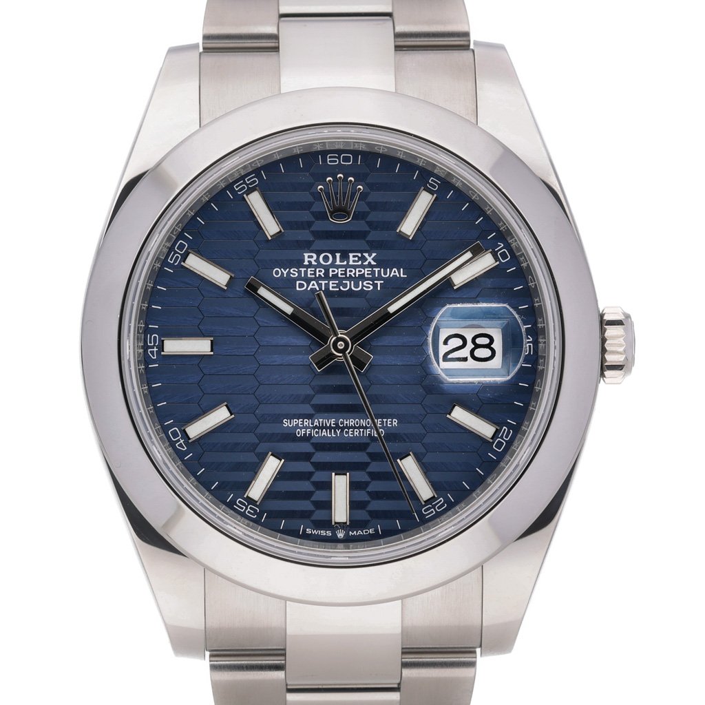 This Rolex Datejust 41 126300 has a blue fluted motif dial and a bracelet strap. This Rolex has undergone a thorough inspection of water resistance, accuracy, functionality and condition to determine the level of reconditioning required to meet our strict standards. It has also been referenced against technical documents and manufacturer records where available to ensure authenticity and a clean history. Our watches have a 24-month warranty for your peace of mind, in conjunction with any remaining manufacturer’s warranty from new or from service. To maintain the manufacturer’s warranty on this watch, it has not been polished in our service centre.