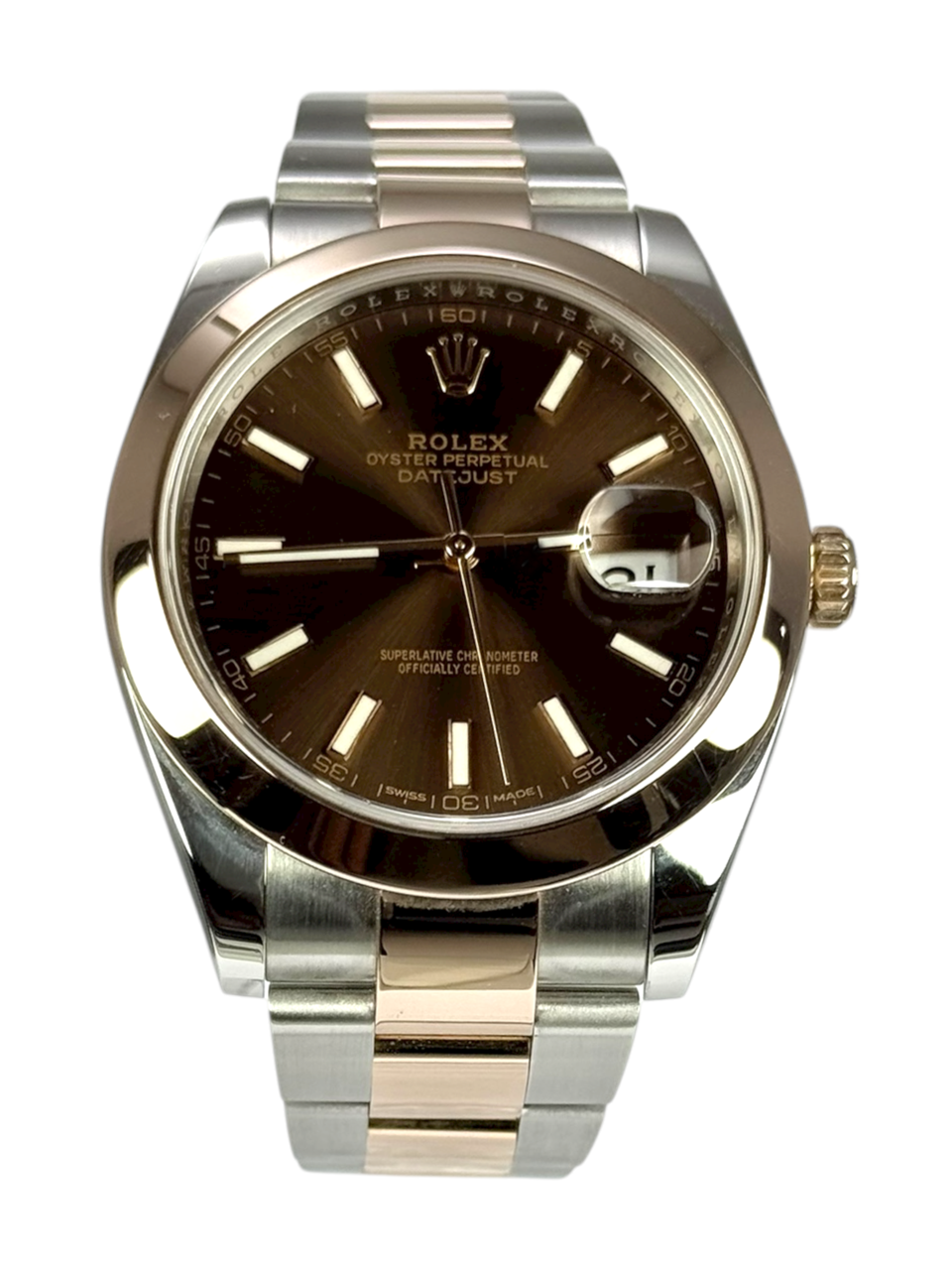 This Rolex Datejust 41 126301 has a chocolate baton dial and a bracelet strap. This Rolex has undergone a thorough inspection of water resistance, accuracy, functionality and condition to determine the level of reconditioning required to meet our strict standards. It has also been referenced against technical documents and manufacturer records where available to ensure authenticity and a clean history. All our watches have a 24-month warranty for your peace of mind. One of our skilled polishing technicians has removed marks on the case and bracelet of this watch, brought about by daily wear and tear, which is why this watch does not come with the remaining manufacturer’s warranty.